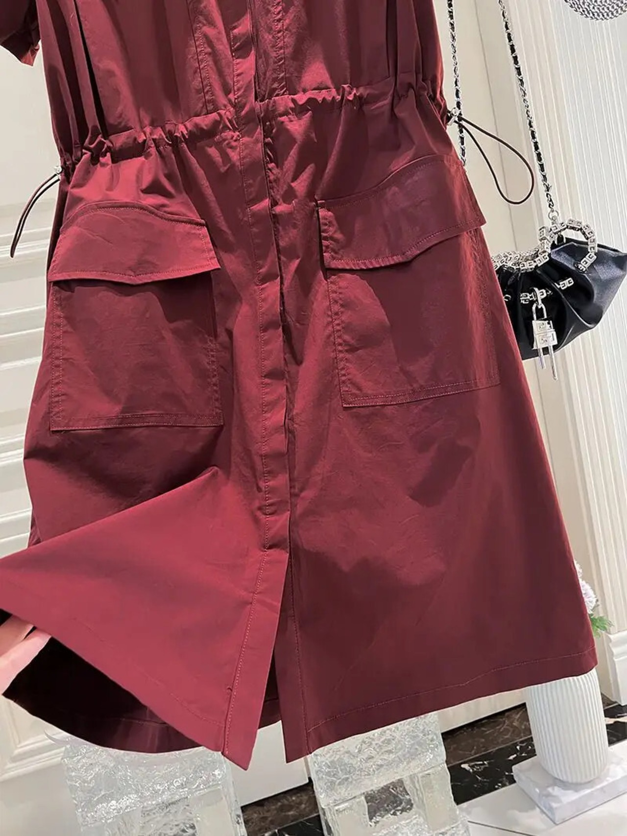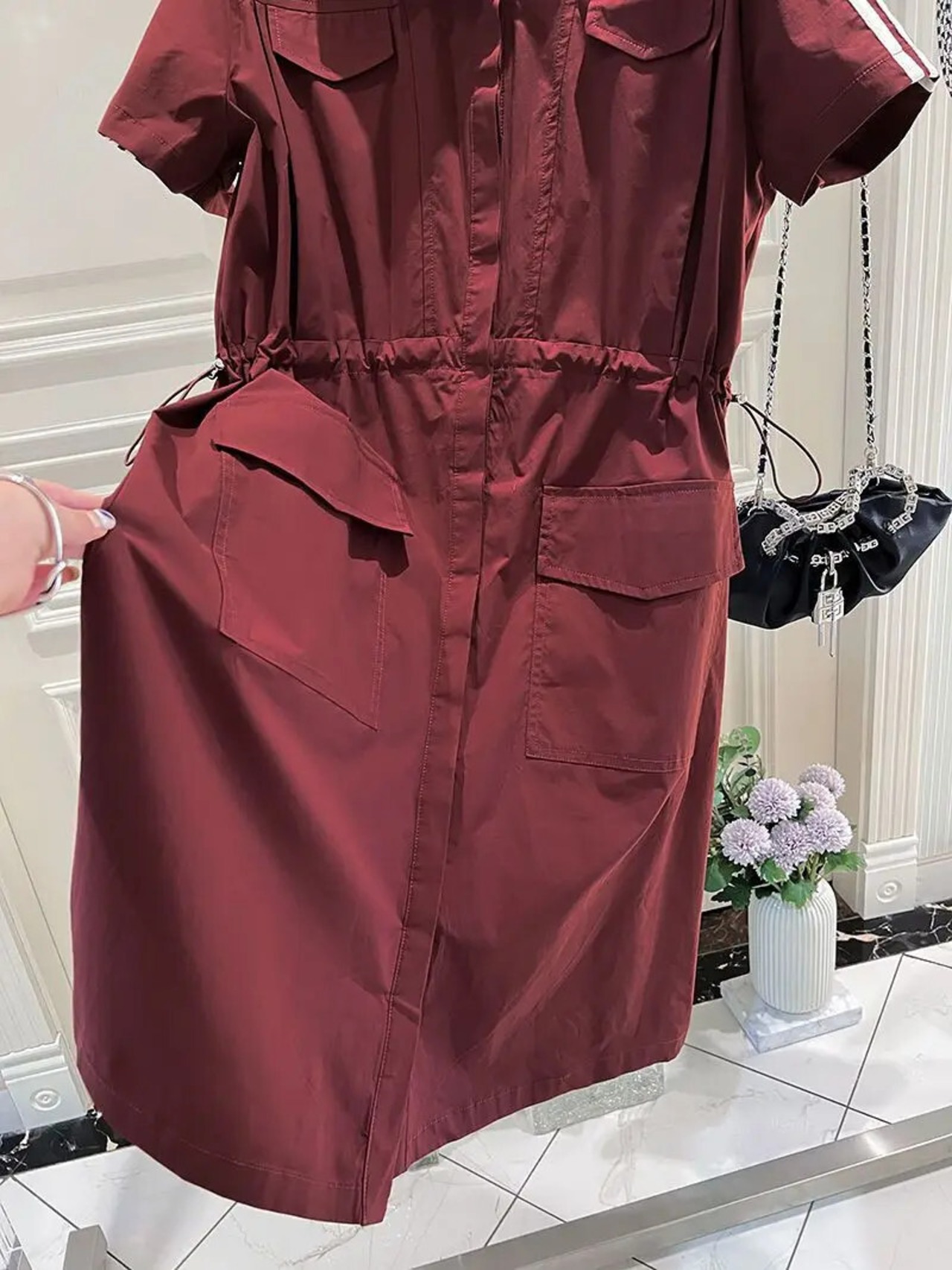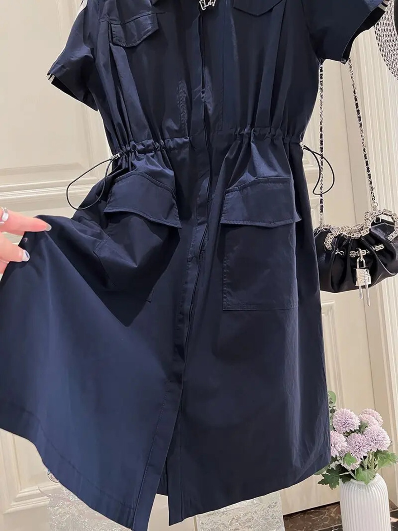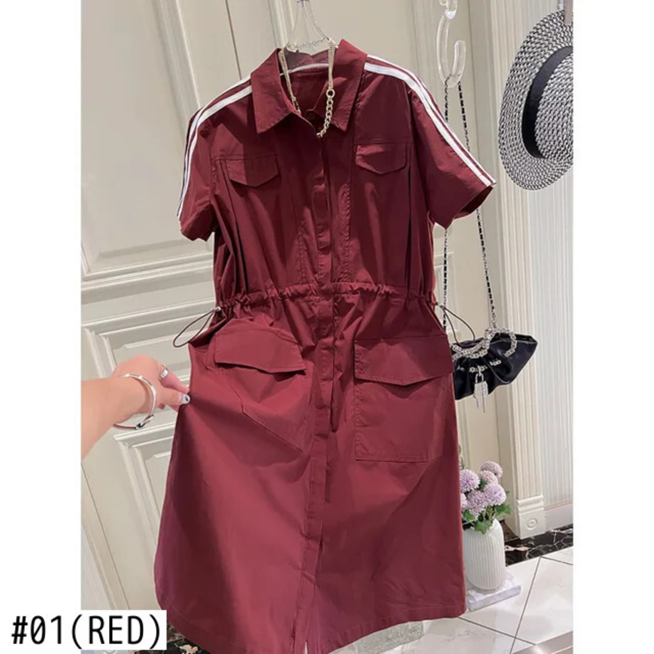 Nomikuma シングルブレスト半袖ターンダウンカラードレス巾着スリムウエストドレス ショート ハーフスリーブ