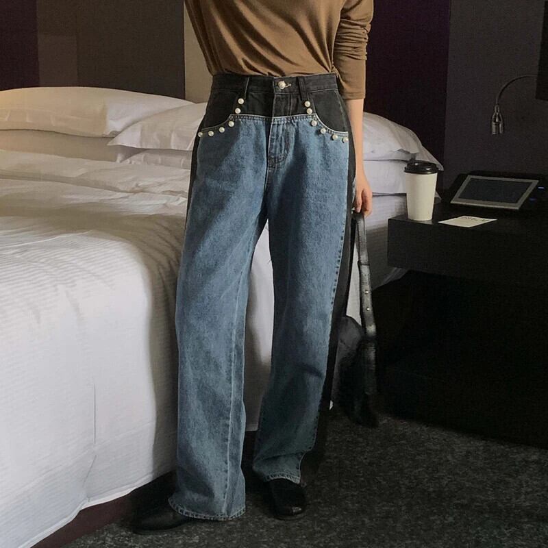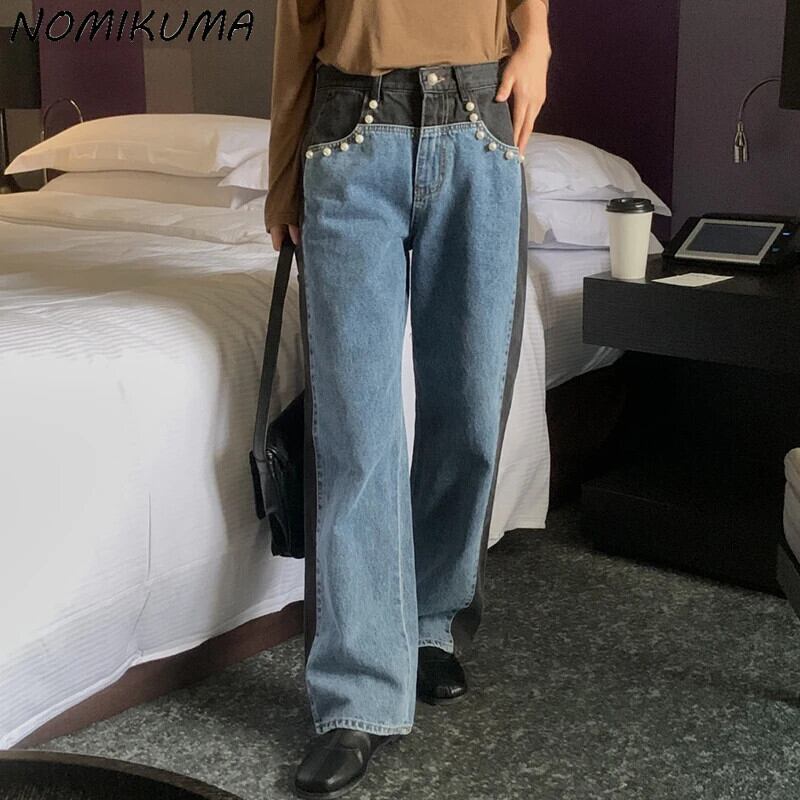 Nomikuma シック秋ヒットカラービーズウエストロングジーンズパンツ因果秋ワイドレッグデミンズボン オータム 秋物 ワイドパンツ