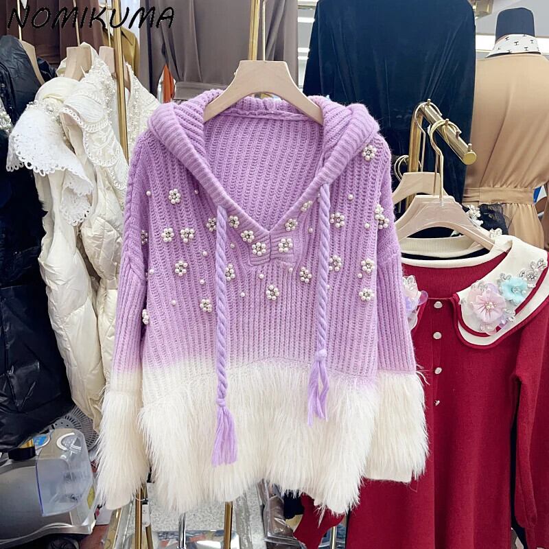 Nomikuma ビーズ巾着フード付きプルオーバーセーター因果パッチワークタイダイニット秋冬プル オータム 秋物 ウィンター 冬物