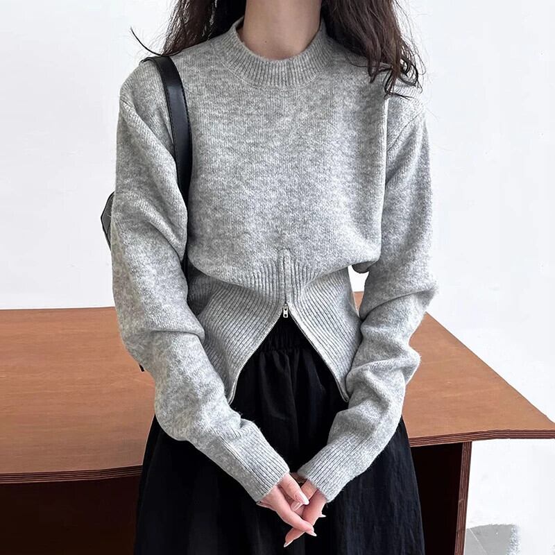 Nomikuma O ネックジッパーソリッドセーターシック秋因果長袖プルオーバーニットトップス ロング オータム 秋物 Oネック ソリッドカラー