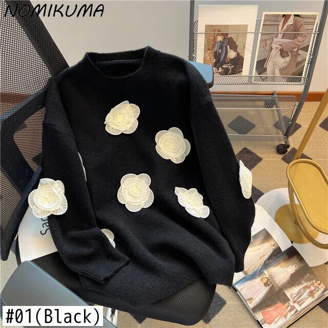 Nomikuma 甘い 3D 花ニットソフト因果セーター秋冬長袖 O ネックプルオーバーニットトップス ロング 大人ガーリー スウィート キュート カジュアル オータム 秋物 ウィンター 冬物 Oネック フラワーデザイン