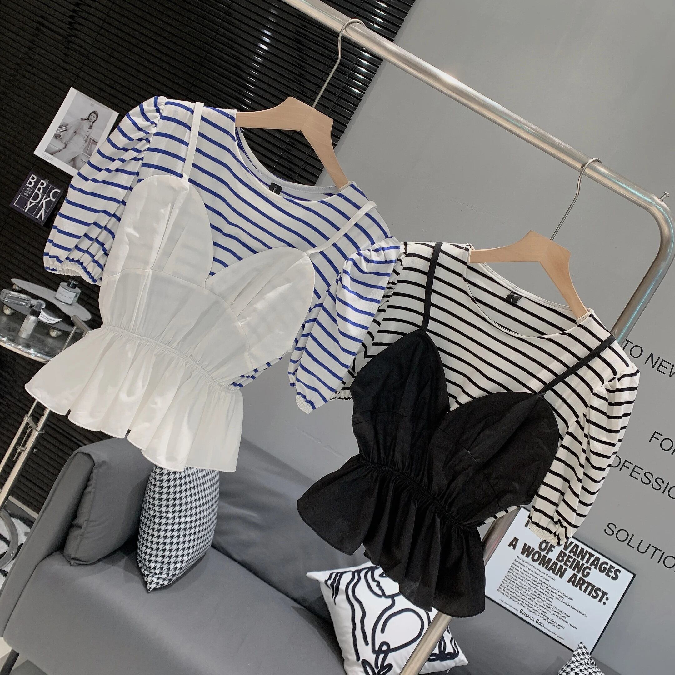 Nomikuma パッチワークストライプパッチワークフェイク 2 枚グラフィック T シャツ夏パフスリーブ O ネックスリムウエストフリル Y2k トップ サマー 夏物 Oネック Tシャツ