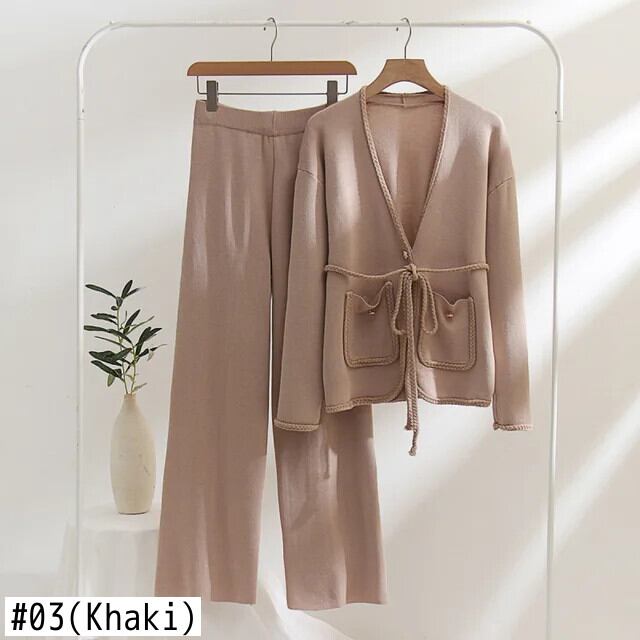 Nomikuma セーター ニット 2 枚セット ソリッド カジュアル レースアップ カーディガン コート + ウエスト ロング パンツ 秋冬 オータム 秋物 ウィンター 冬物 ソリッドカラー