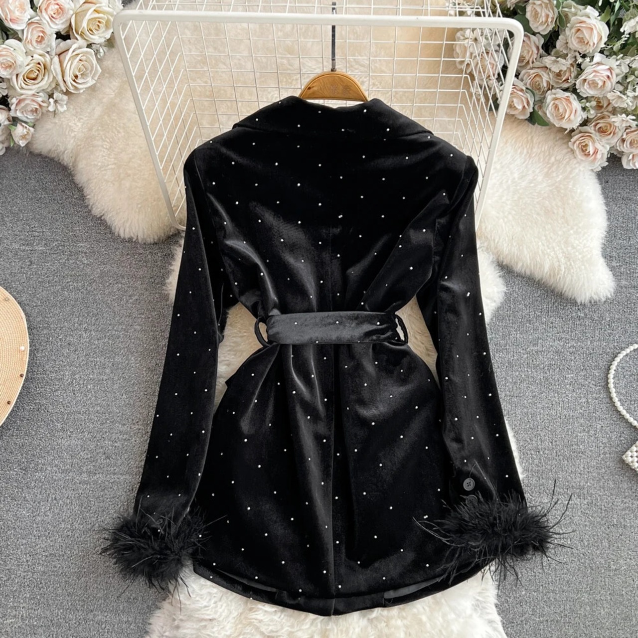Nomikuma 秋冬ダイヤモンドベルベット羽パッチワークスーツコートドレス包帯スリムウエスト黒スーツトップ ブラック オータム 秋物 ウィンター 冬物