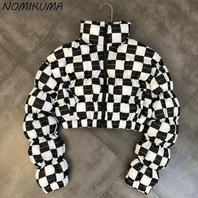 Nomikuma スタンドネック冬コートジッパー折り目パフスリーブショートチェック柄パーカージャケット 6N891 ウィンター 冬物