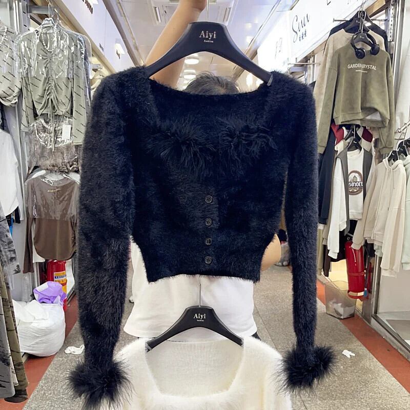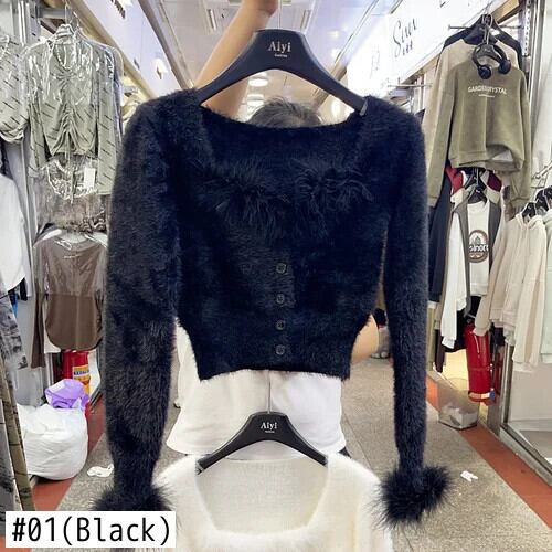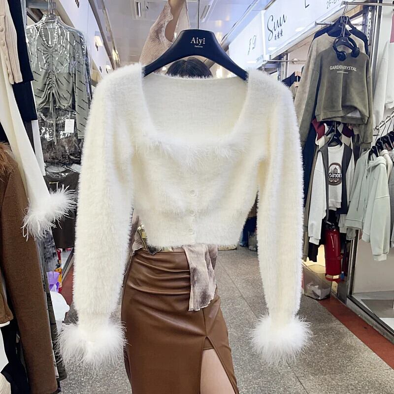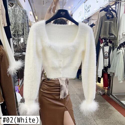 Nomikuma 秋冬ファーパッチワークスクエアカラー長袖ニットショートニットセータートップス ロング オータム 秋物 ウィンター 冬物 スクウェア