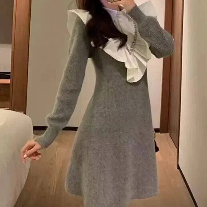 Nomikuma ダイヤモンド フリル ターンダウンカラー パッチワーク セーター ドレス 秋冬ニット スリム ウエスト A ライン ドレス オータム 秋物 ウィンター 冬物 Aライン