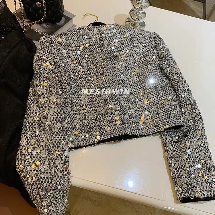 Nomikuma 秋スパンコールショートコートシングルブレスト O ネックカーディガントップスシックキラキラジャケット オータム 秋物 Oネック