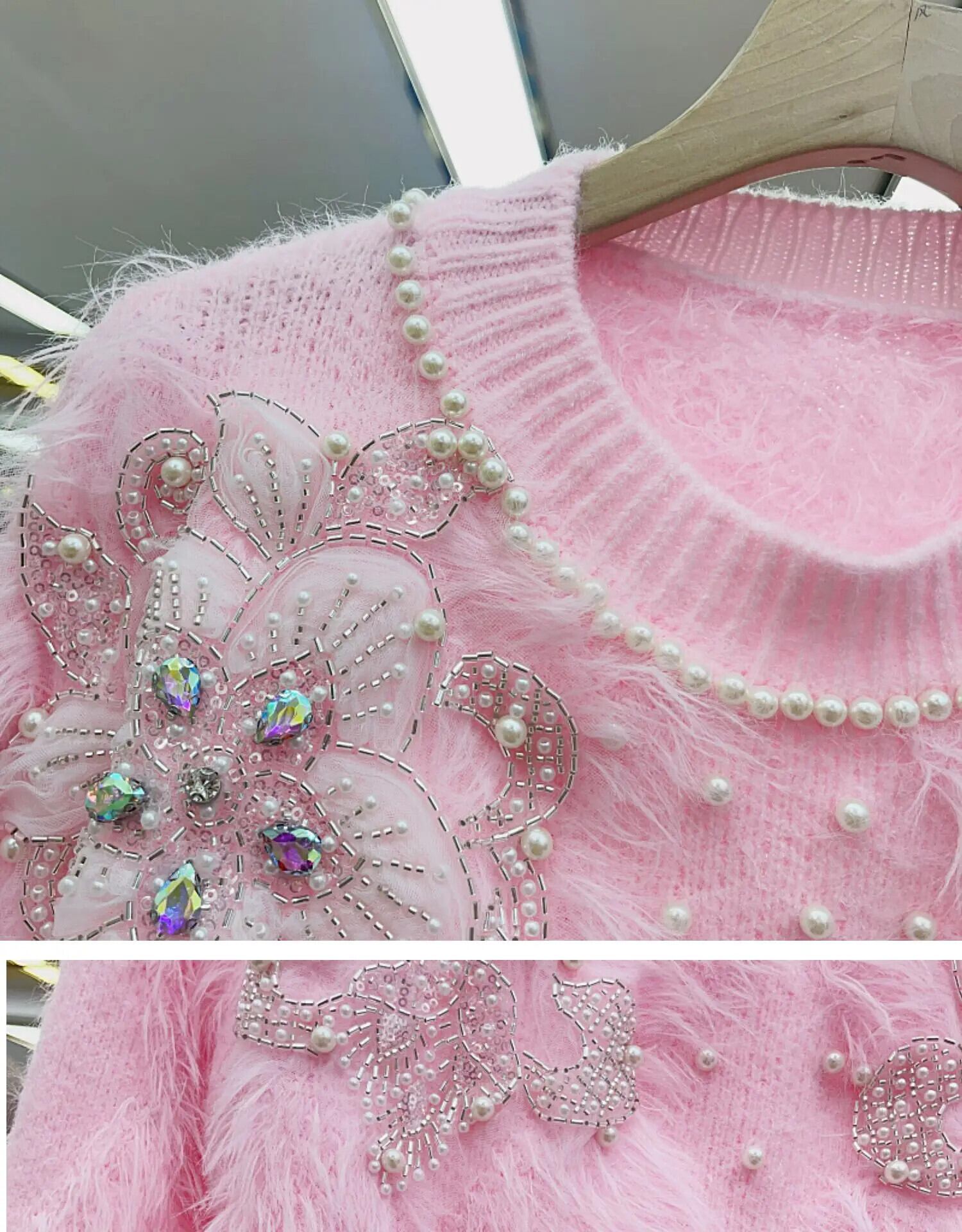 Nomikuma 秋冬ビーズ スパンコール ラウンドネック ソリッド カラー イミテーション ミンク カシミア セーター ニット トップ オータム 秋物 ウィンター 冬物 Oネック ソリッドカラー
