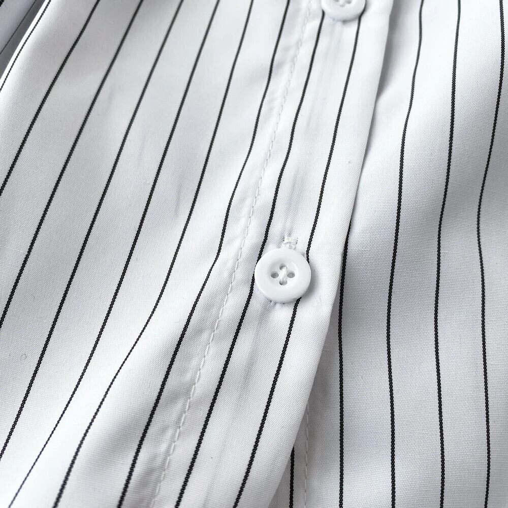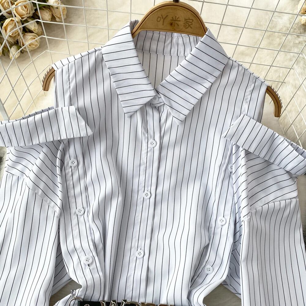Nomikuma 秋カジュアルターンダウンカラーストラップレスミディアムロングベルトスリムウエストストライプブラウスシャツ オータム 秋物 ハーネス