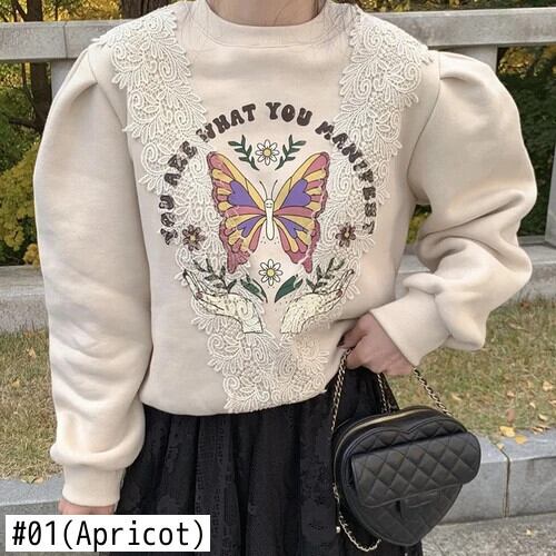 Nomikuma シック秋 O ネックパッチワークレースフック蝶 Letetrs プリント Logn スリーブスウェットシャツジャンパー オータム 秋物 Oネック