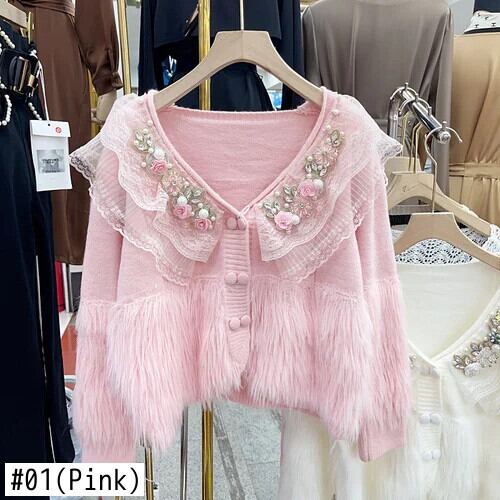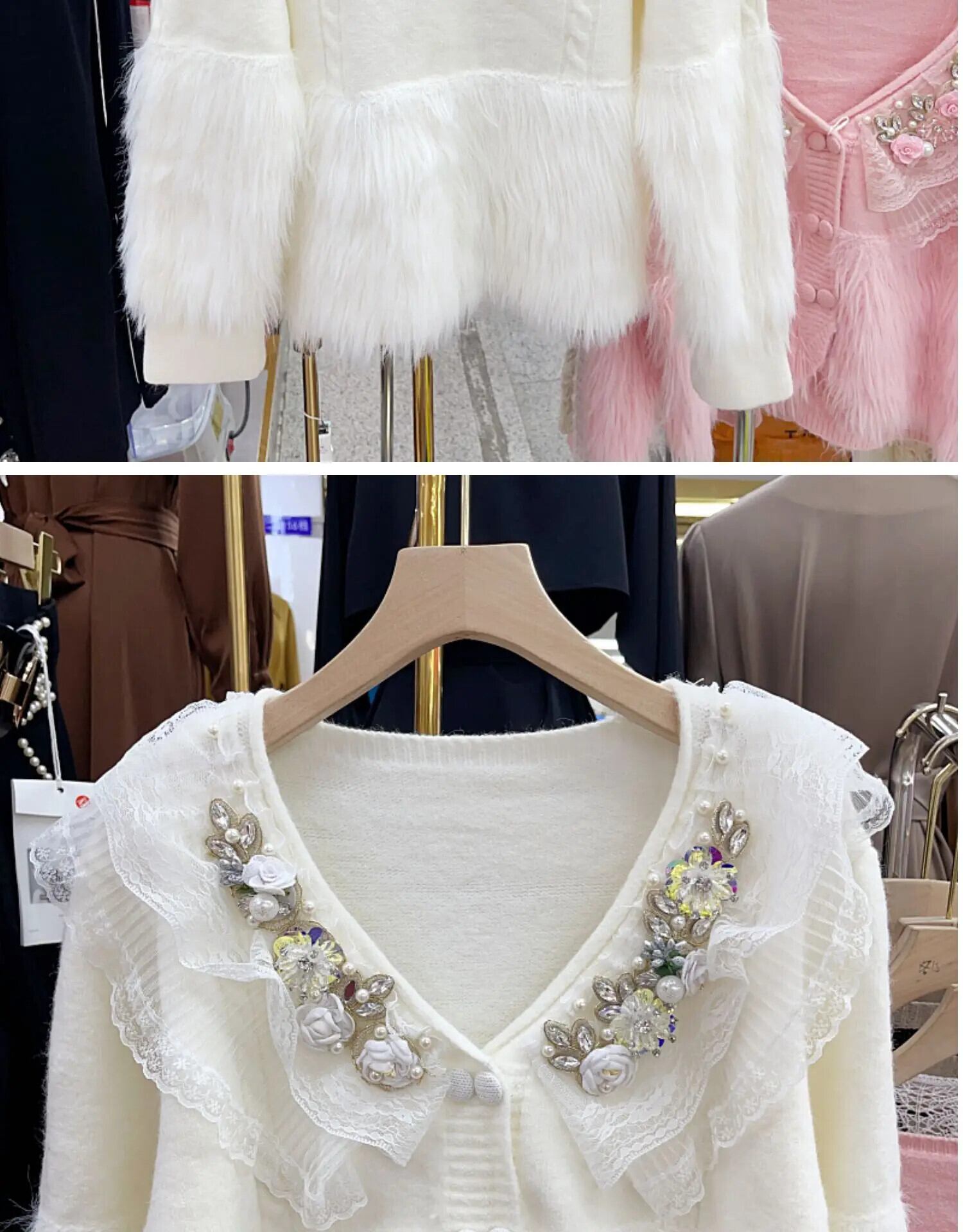 Nomikuma 秋冬スイートカジュアルフェイクミンクカシミヤショートニットカーディガンシック 3D 花フリルパッチワーク V ネックセーター 大人ガーリー スウィート キュート オータム 秋物 ウィンター 冬物 ファー Vネック フラワーデザイン