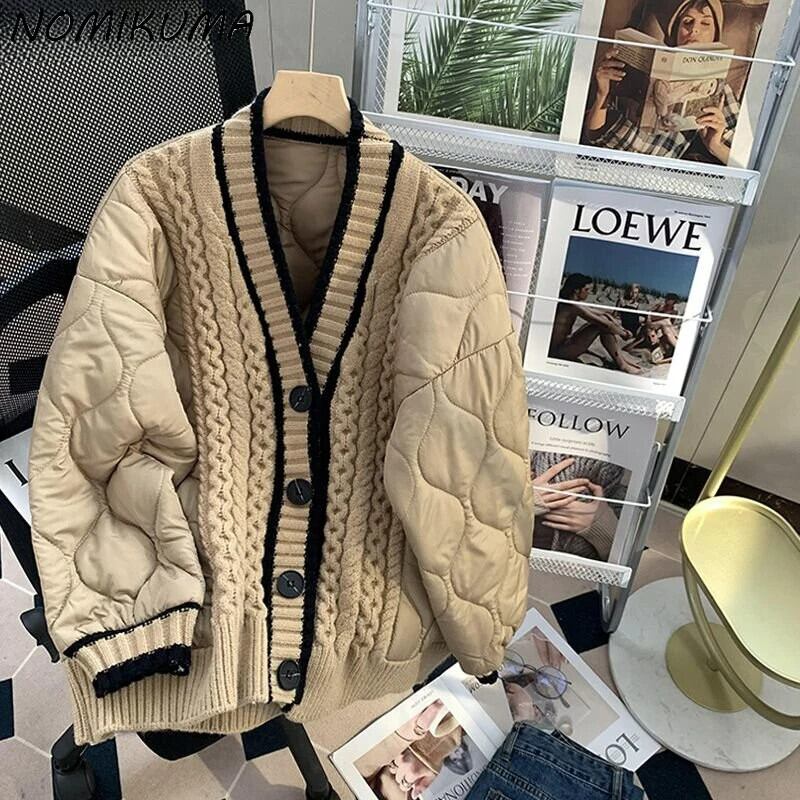Nomikuma パーカーパッチワーク因果ニットコート長袖シングルブレスト V ネックジャケット秋冬セーター ロング オータム 秋物 ウィンター 冬物 Vネック