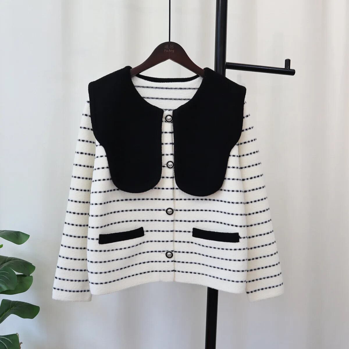Nomikuma 秋冬セーラーカラーコート長袖ストライプジャケットフェイクミンクカシミヤニットカーディガン ロング オータム 秋物 ウィンター 冬物 ファー