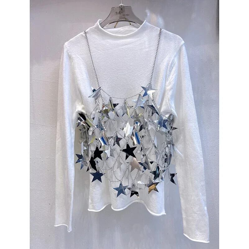 Nomikuma 秋スパイシーガールスパンコールスリングベスト + 半襟ストレッチスリム底ニットトップスニットセット オータム 秋物