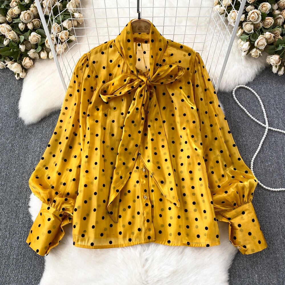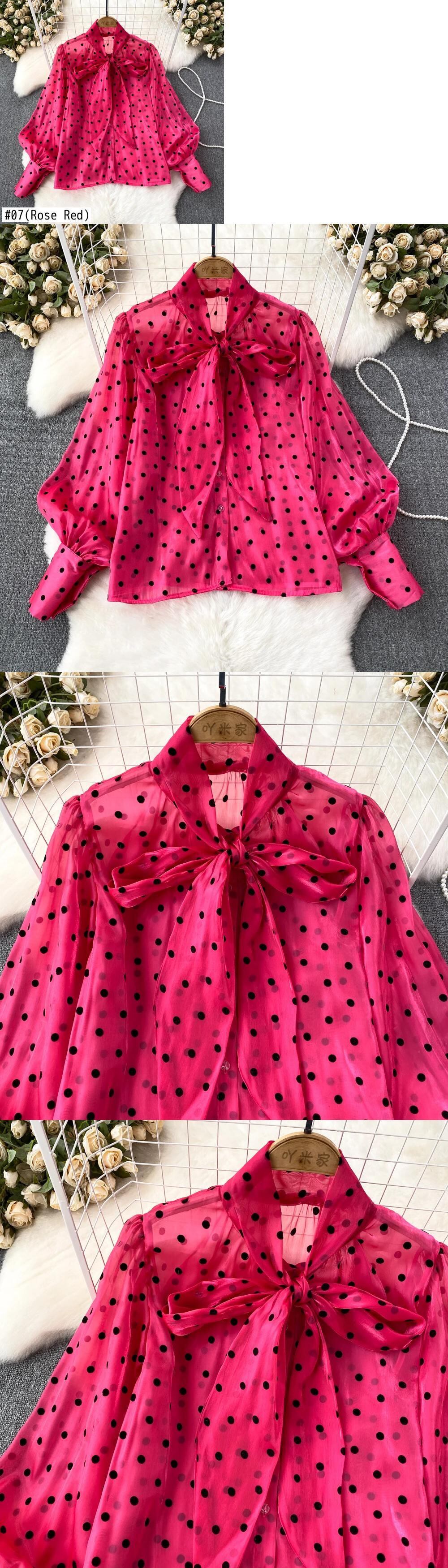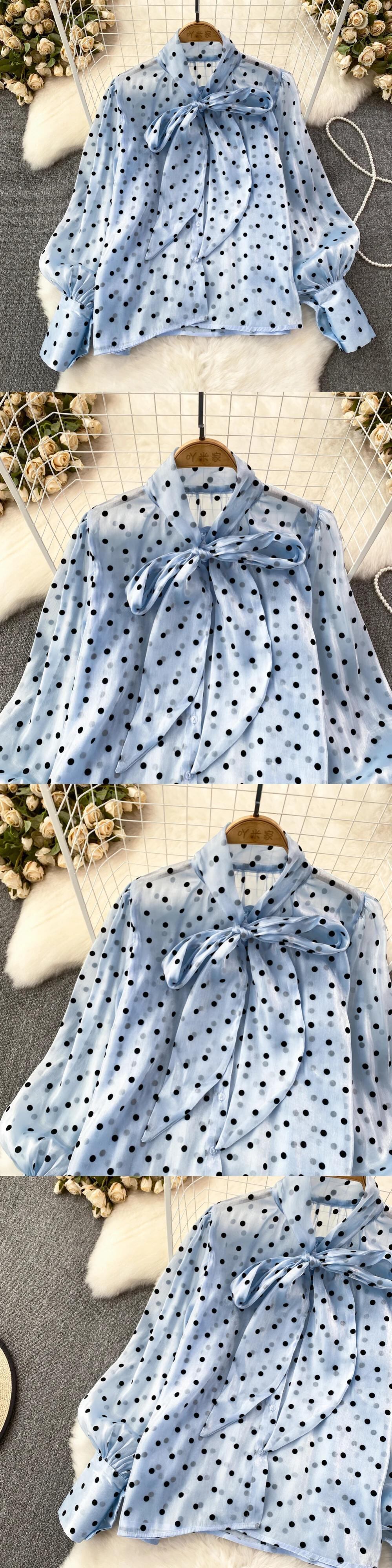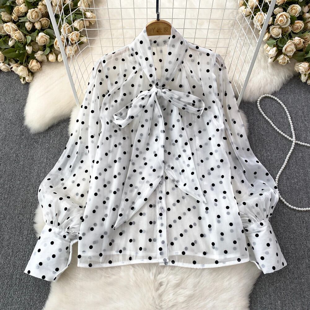 [ノミクマ] 春秋 スイートランタン 長袖 蝶ネクタイ シフォンシャツ レディース トップス デ ロング リボン 大人ガーリー スウィート キュート カジュアル スプリング 春物 オータム 秋物