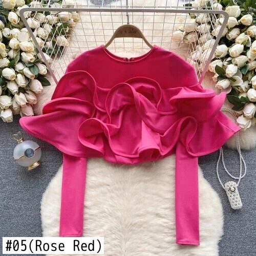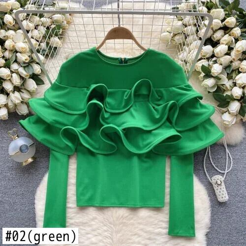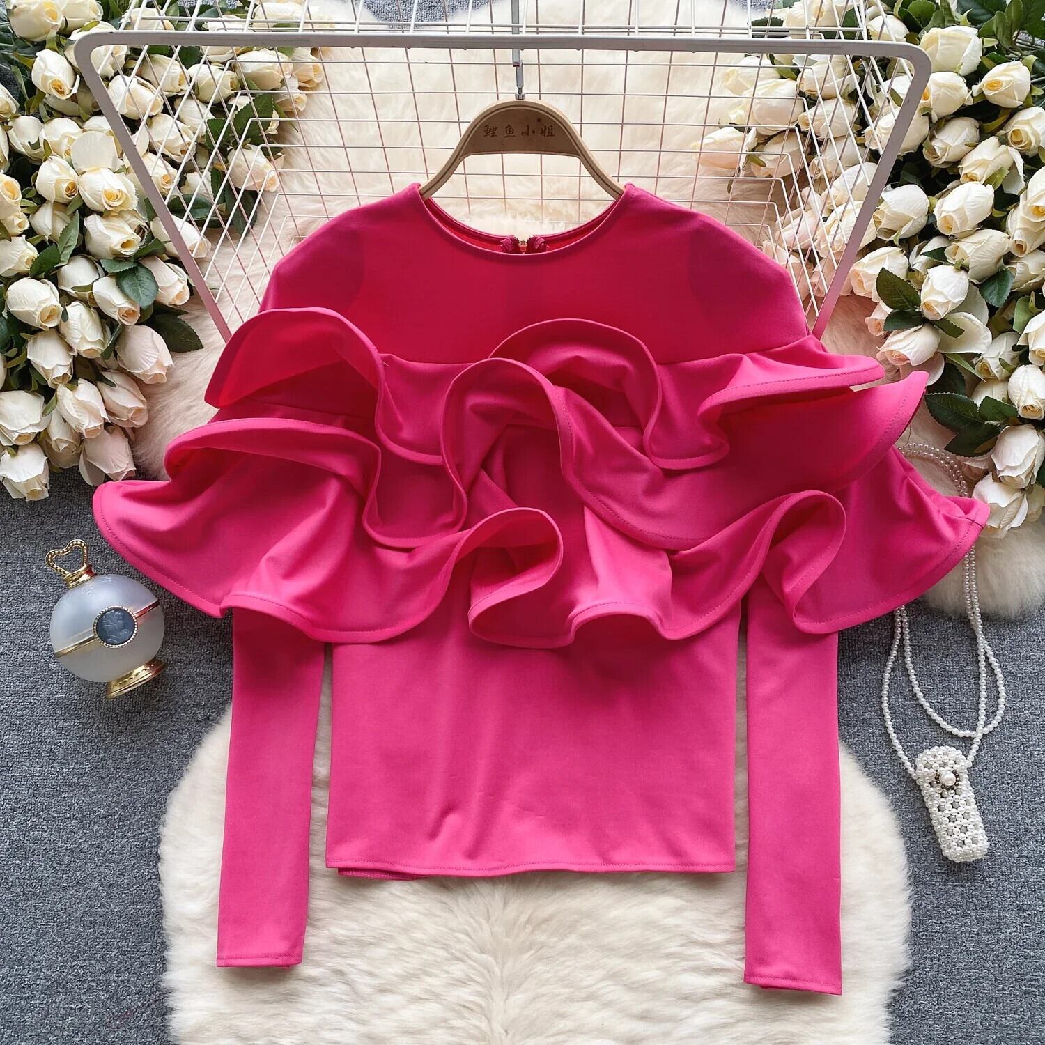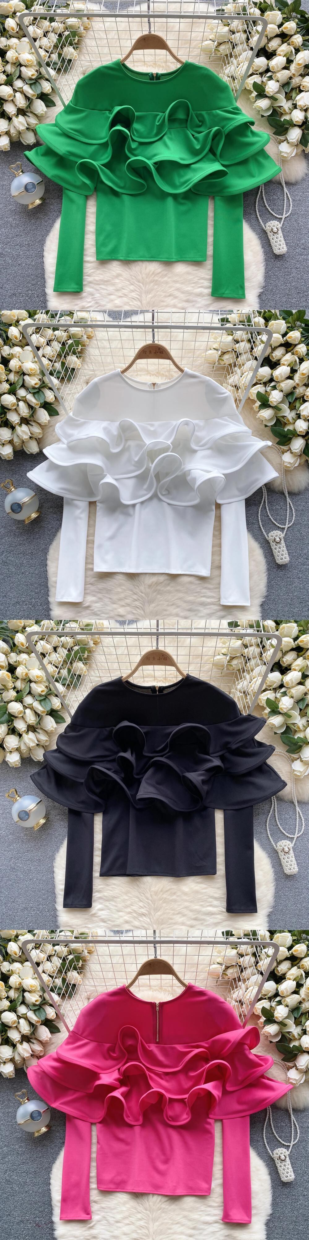 Nomikuma レトロラウンドネック Tシャツ秋冬フリルニッチライト高級底入れ Tシャツトップ オータム 秋物 ウィンター 冬物 Oネック