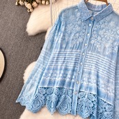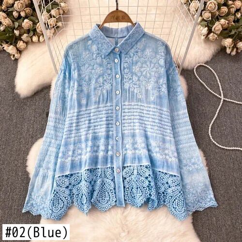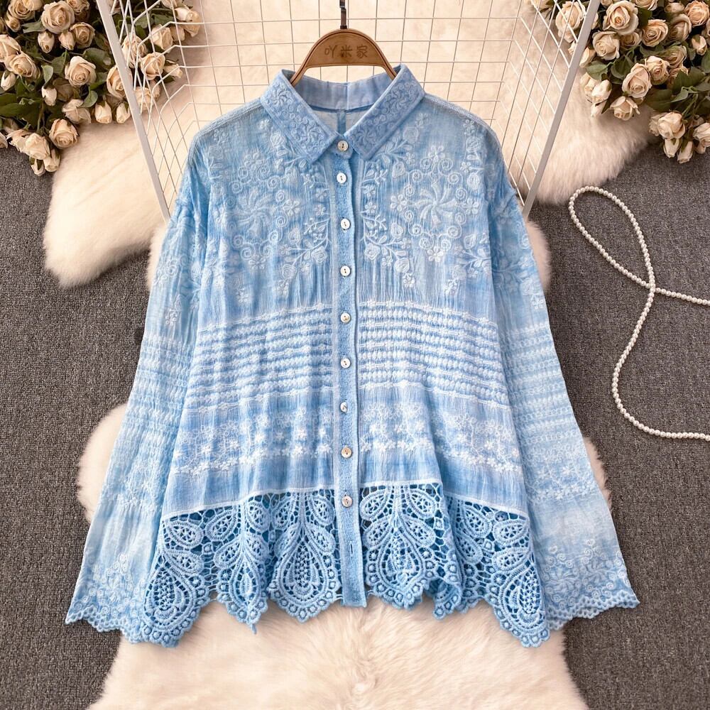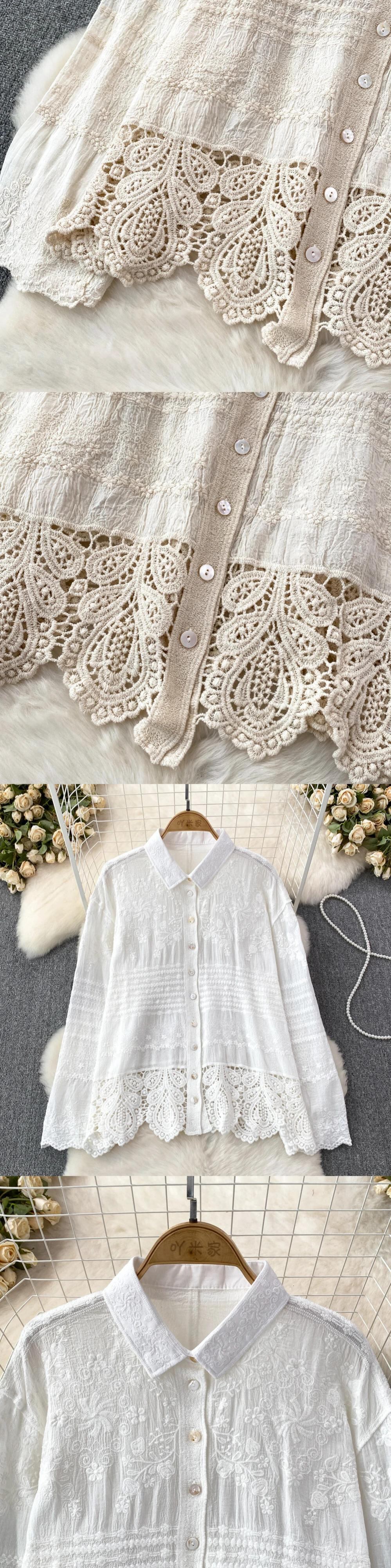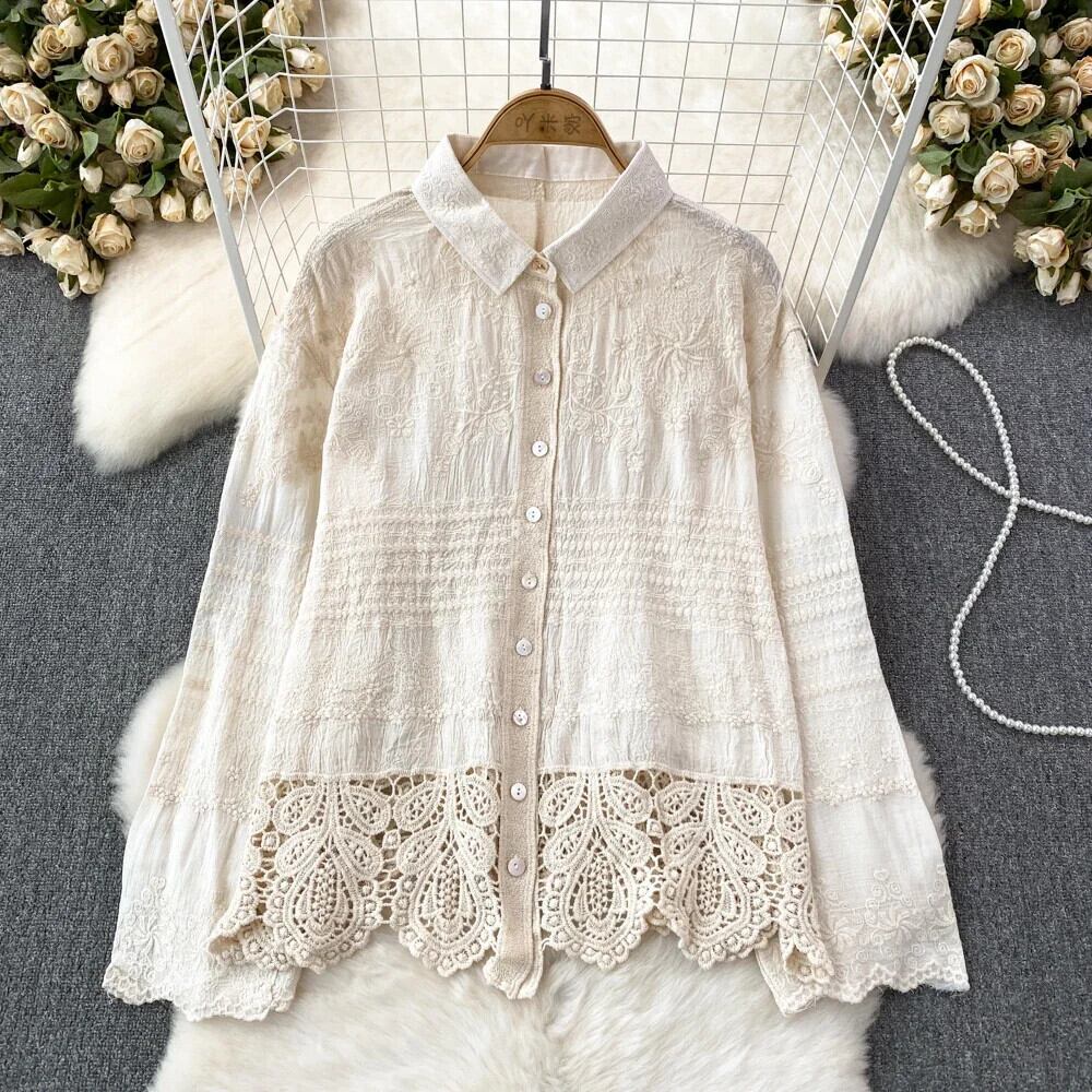 Nomikuma 春秋長袖ターンダウンカラーシングルブレストコットン刺繍レースブラウスシャツトップ ロング レッド スプリング 春物 オータム 秋物