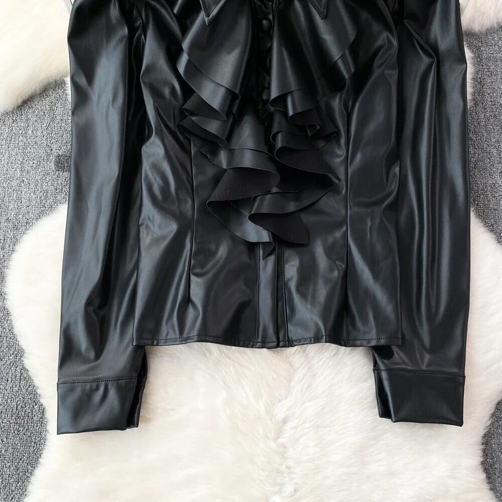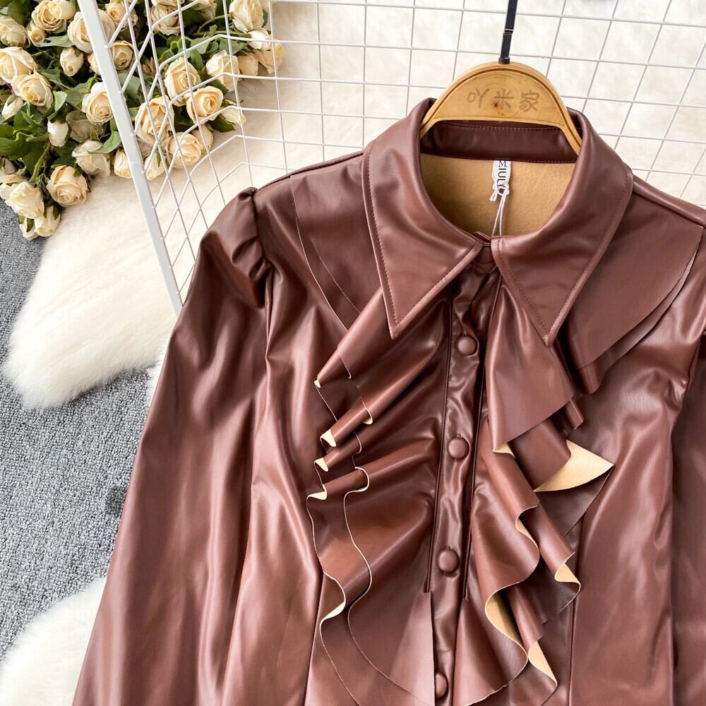 Nomikuma 秋冬長袖ターンダウン襟フリルエッジシングルブレスト PU シャツレザートップ ロング オータム 秋物 ウィンター 冬物