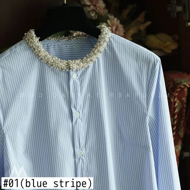 Nomikuma シックビーズ O ネック長袖ストライプブラウス因果レディーストップス秋シャツデ ロング オータム 秋物 Oネック