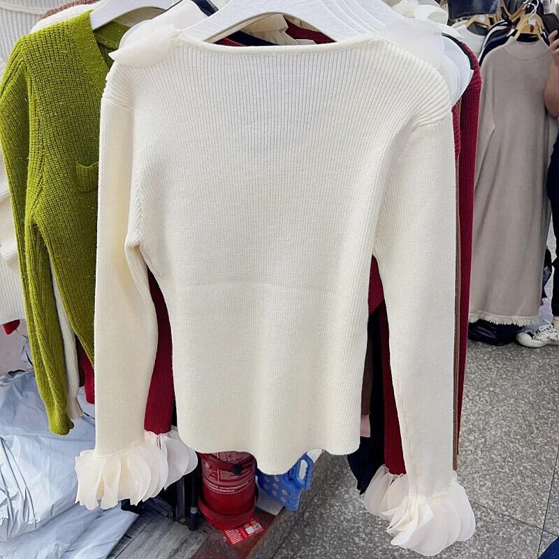 Nomikuma 花びら V ネック配色長袖セーター秋スリムニッチ長袖ニットトップス ロング オータム 秋物 Vネック