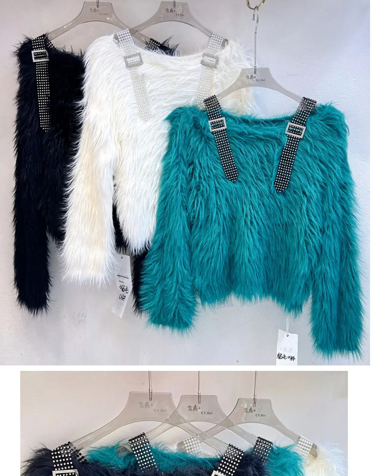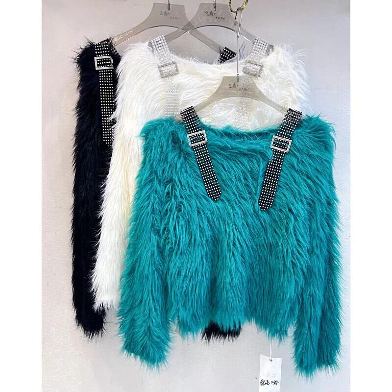 Nomikuma フェイクミンクカシミヤオフショルダーストラップセーター秋冬ショートスパイシーガールセクシーストラップレスプルオーバーニットトップス オータム 秋物 ウィンター 冬物 ファー