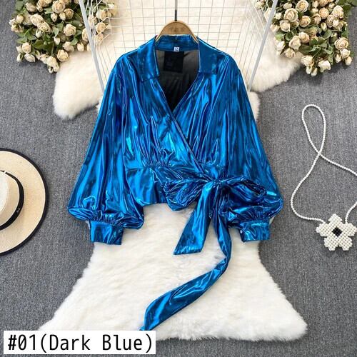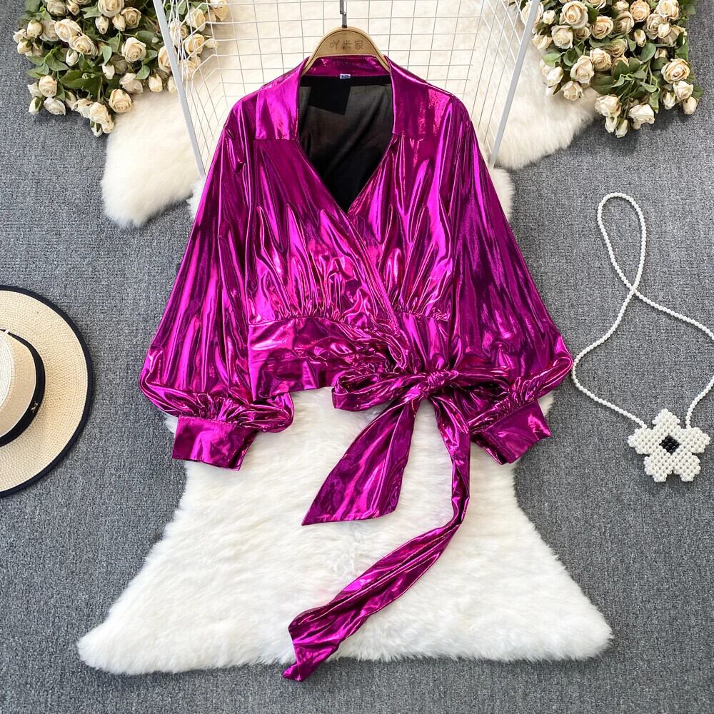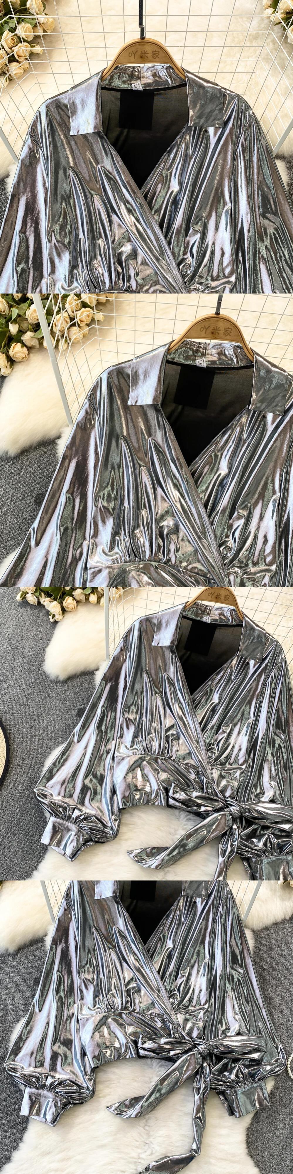 Nomikuma 秋ランタン長袖 V ネックシャツ弓包帯ショートトップス De ロング リボン オータム 秋物 Vネック