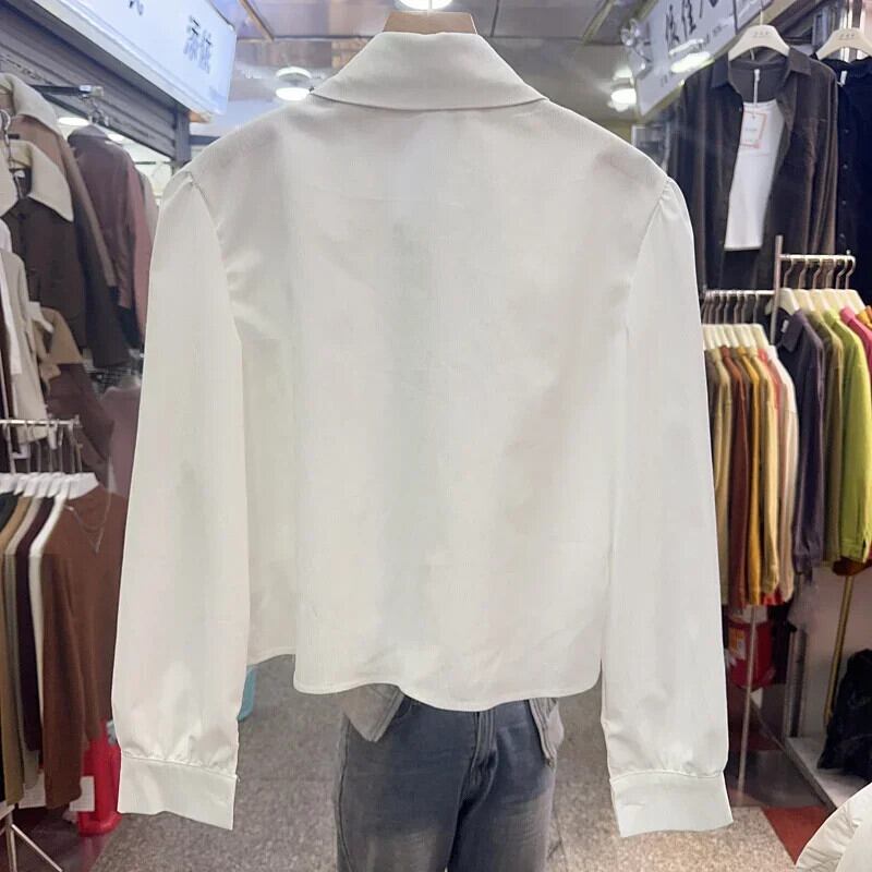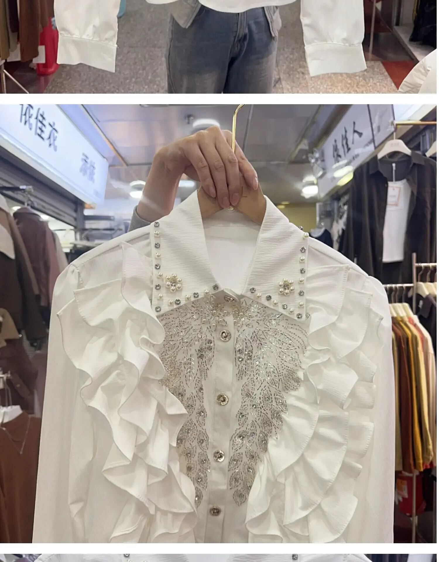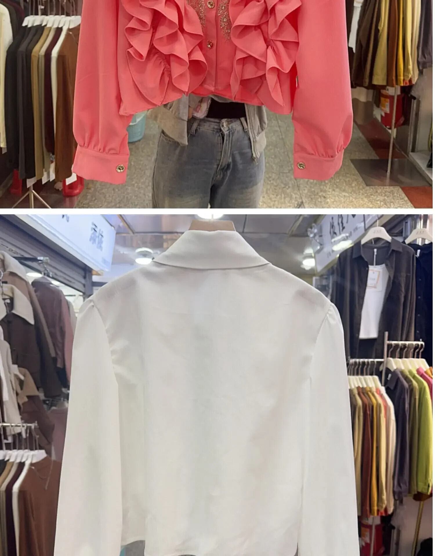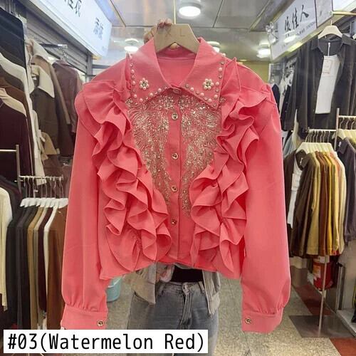 Nomikuma 刺繍くり抜きフリルエッジ立ち襟シャツ秋/冬ニッチ長袖トップ ロング レッド オータム 秋物 ウィンター 冬物