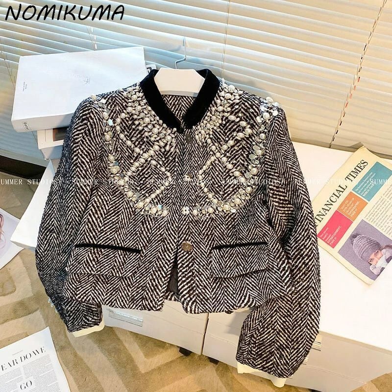 Nomikuma ビーズ秋ジャケットヒットカラースタンドネックカーディガン生き抜くコート オータム 秋物