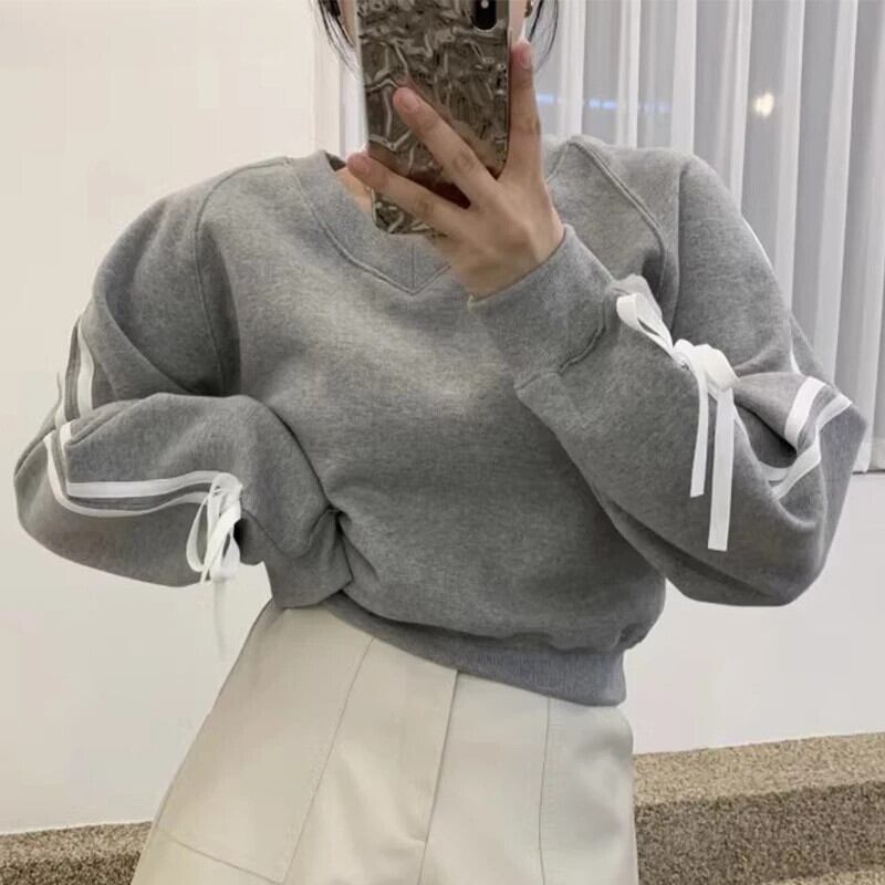Nomikuma シック秋冬 V ネック リボン ちょう結び カジュアル フリース 暖かい スウェットシャツ ウール ジャンパー オータム 秋物 ウィンター 冬物 Vネック
