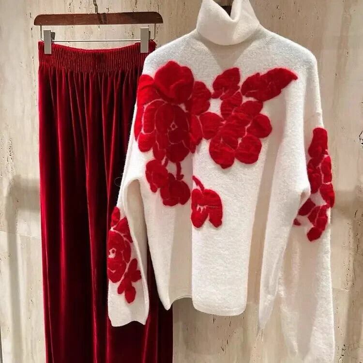 Nomikuma レッドジャカードプルオーバーニットセーター秋冬プルカジュアル長袖タートルネックニットトップ ロング オータム 秋物 ウィンター 冬物