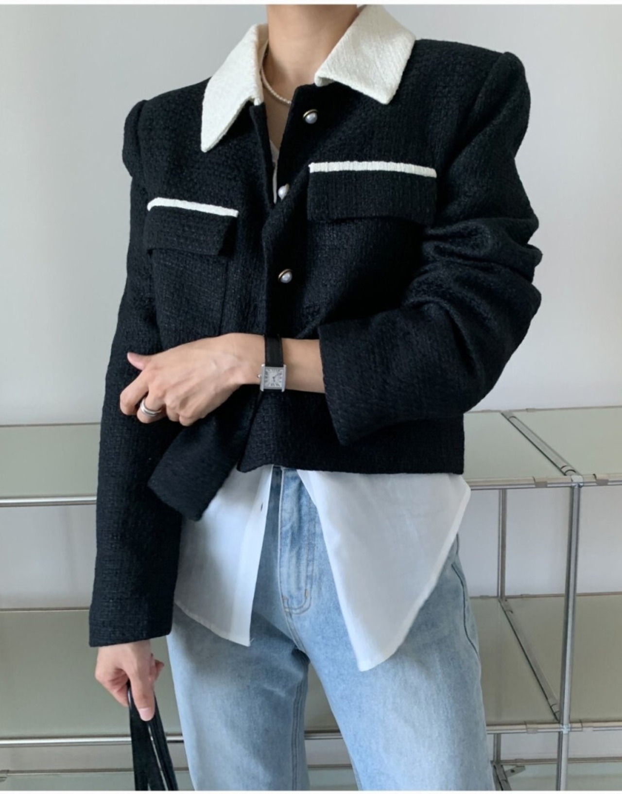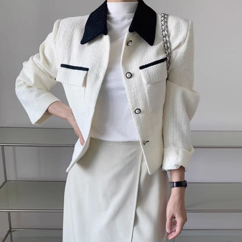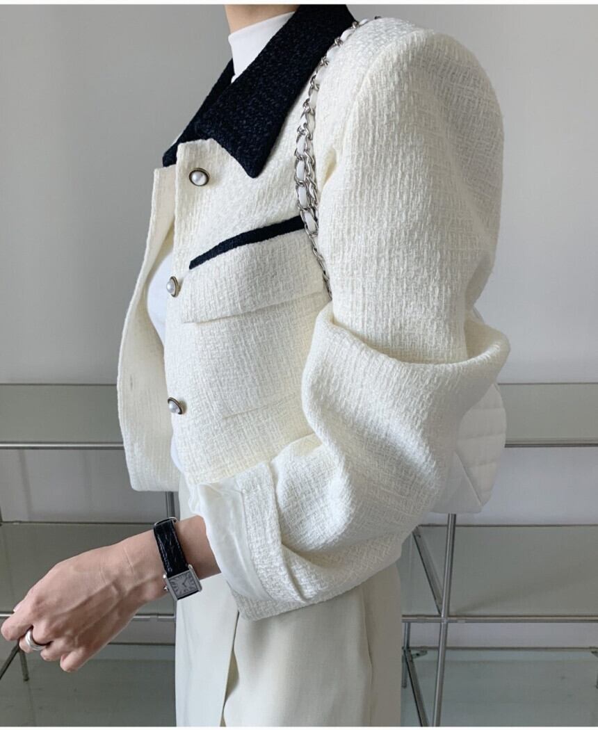 Nomikuma シック秋ヒットカラーターンダウン襟コントラストパールボタンポケット多用途長袖コート ロング オータム 秋物 真珠