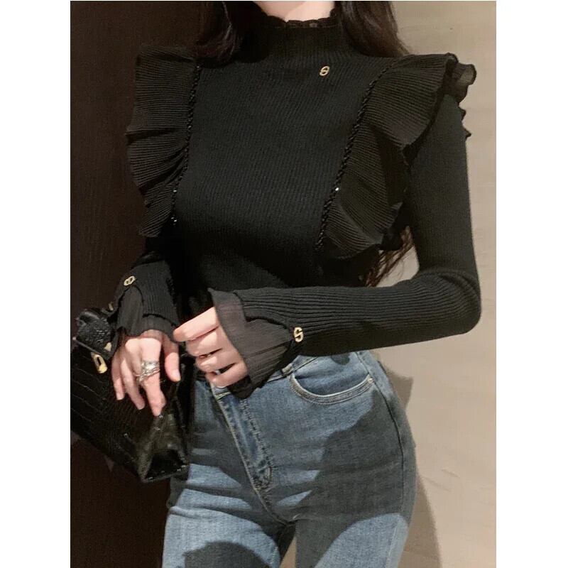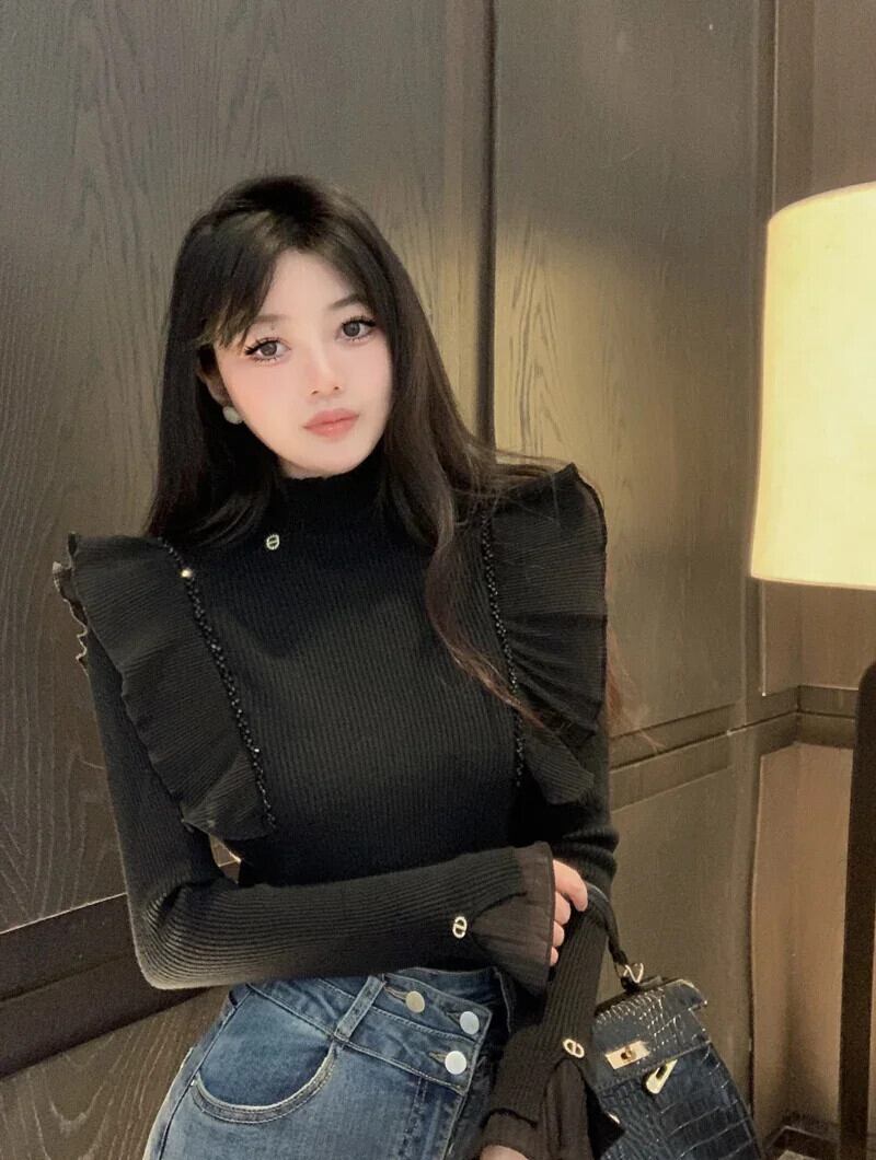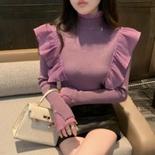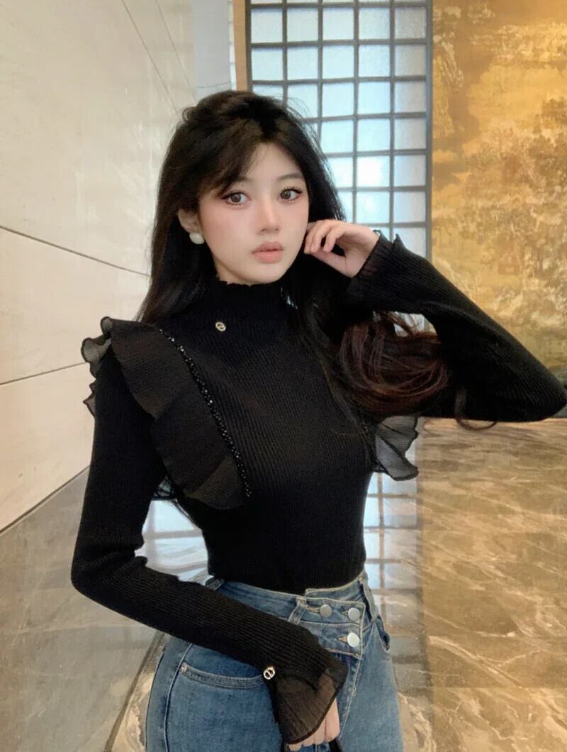 Nomikuma フリルエッジパッチワークネックニットセーターレディース長袖シャツボトム秋冬ショートトップ ロング オータム 秋物 ウィンター 冬物