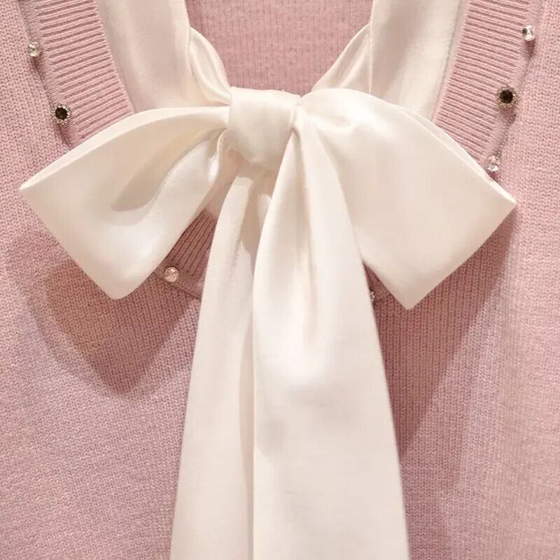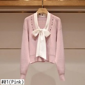 Nomikuma 弓包帯長袖ニットセーター偽二枚ダイヤモンドニットトップスセーターデ ロング リボン