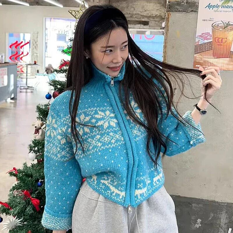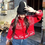 Nomikuma レトロスタンドカラーコントラストジャカード長袖ジッパーセータージャケットニットカーディガンコート ロング レッド