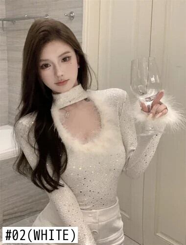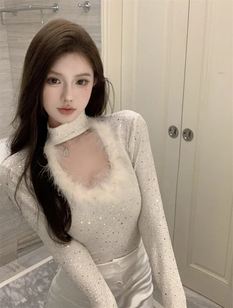 Nomikuma 毛皮パッチワークスパンコールスリムボトリングシャツ半襟セクシー Y2k トップ秋 オータム 秋物