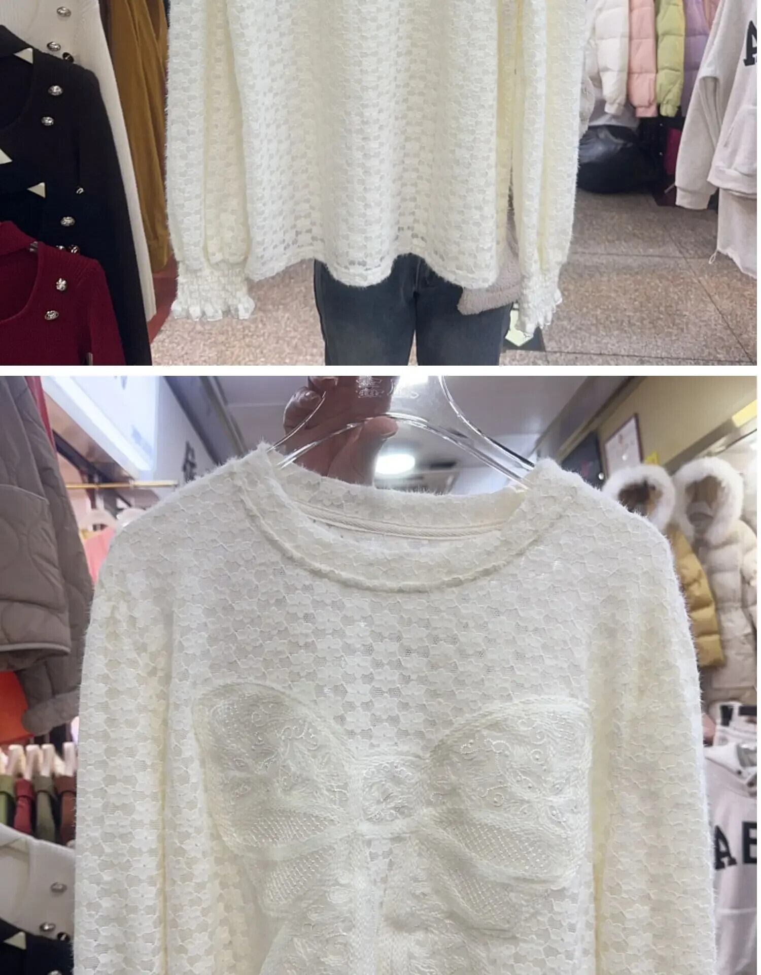 Nomikuma 秋冬甘いパッチワークちょう結び因果プルオーバー O ネックレーストップス甘いシャツ リボン 大人ガーリー スウィート キュート カジュアル オータム 秋物 ウィンター 冬物 Oネック
