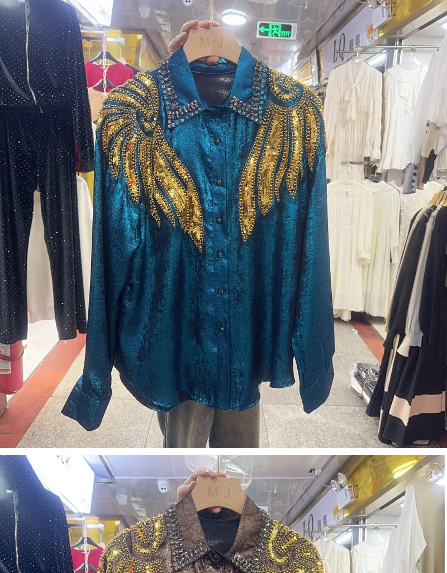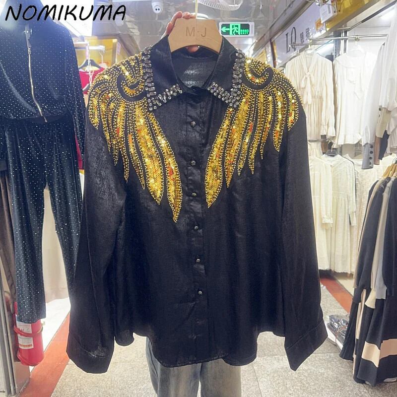 Nomikuma 2024 春トップスシック刺繍ビーズスパンコールシャツスタイルブラウスデ スプリング 春物