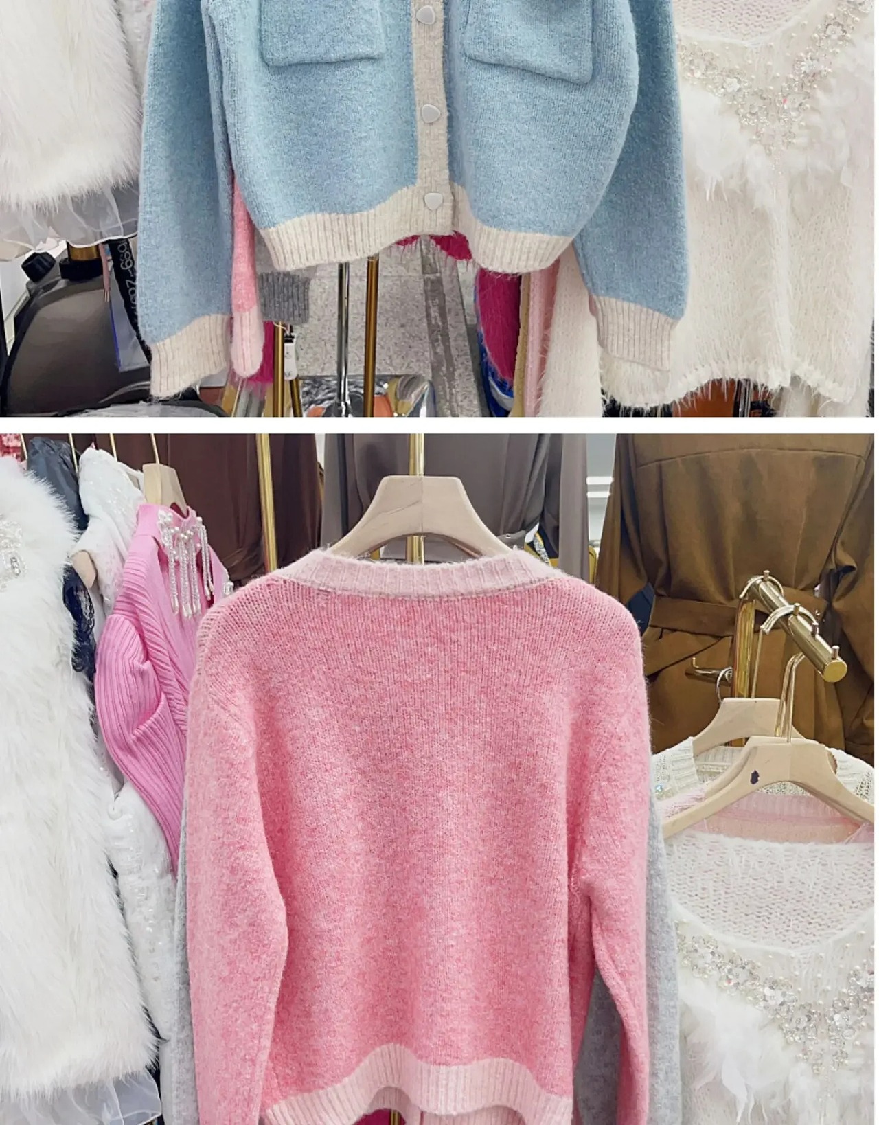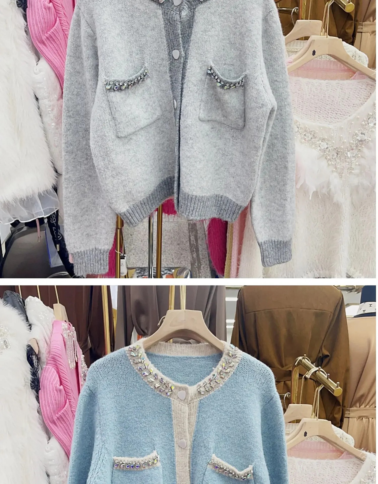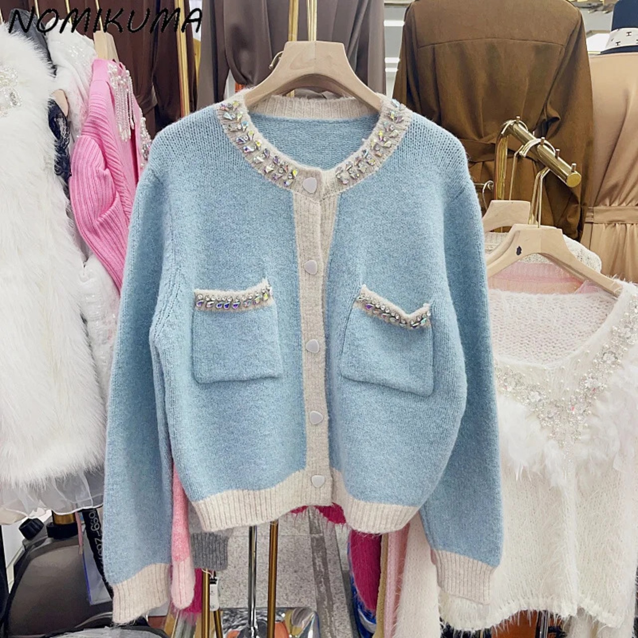 Nomikuma カラーブロッキング レディース ニット 秋冬 痩身 ウエスト ショートカット ダイヤモンド ラウンドネック カーディガン セーター オータム 秋物 ウィンター 冬物 Oネック