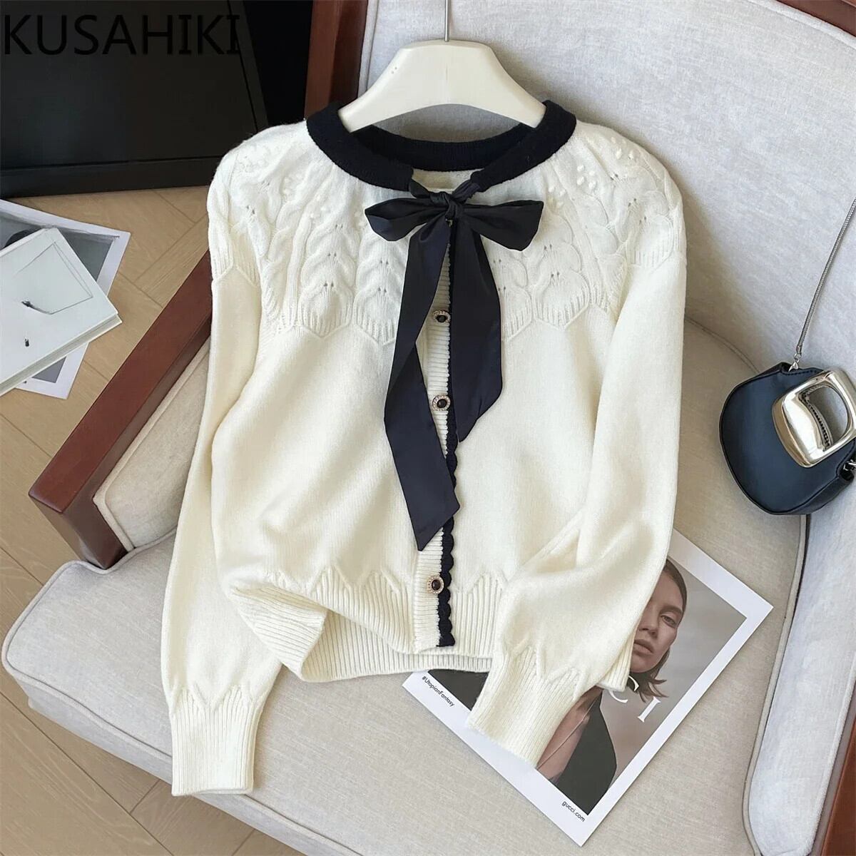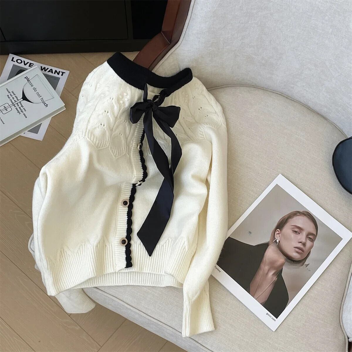 Nomikuma 甘い秋冬ボウレースアップシングルブレスト多用途ニットカーディガンセーターレディースニットコート リボン 大人ガーリー スウィート キュート カジュアル オータム 秋物 ウィンター 冬物