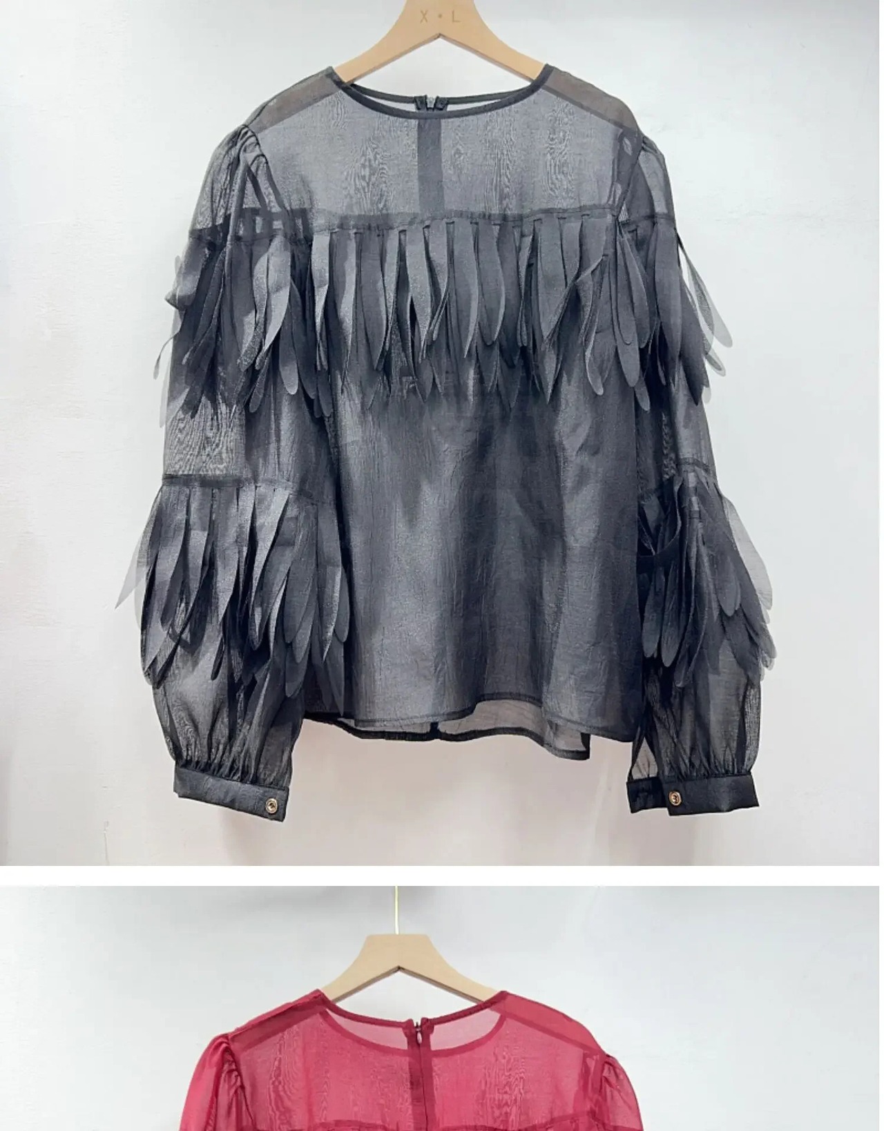 Nomikuma ラウンドネック透視電話長袖シャツ春秋 2024 ニッチシャツユニークトップ ロング スプリング 春物 オータム 秋物 Oネック