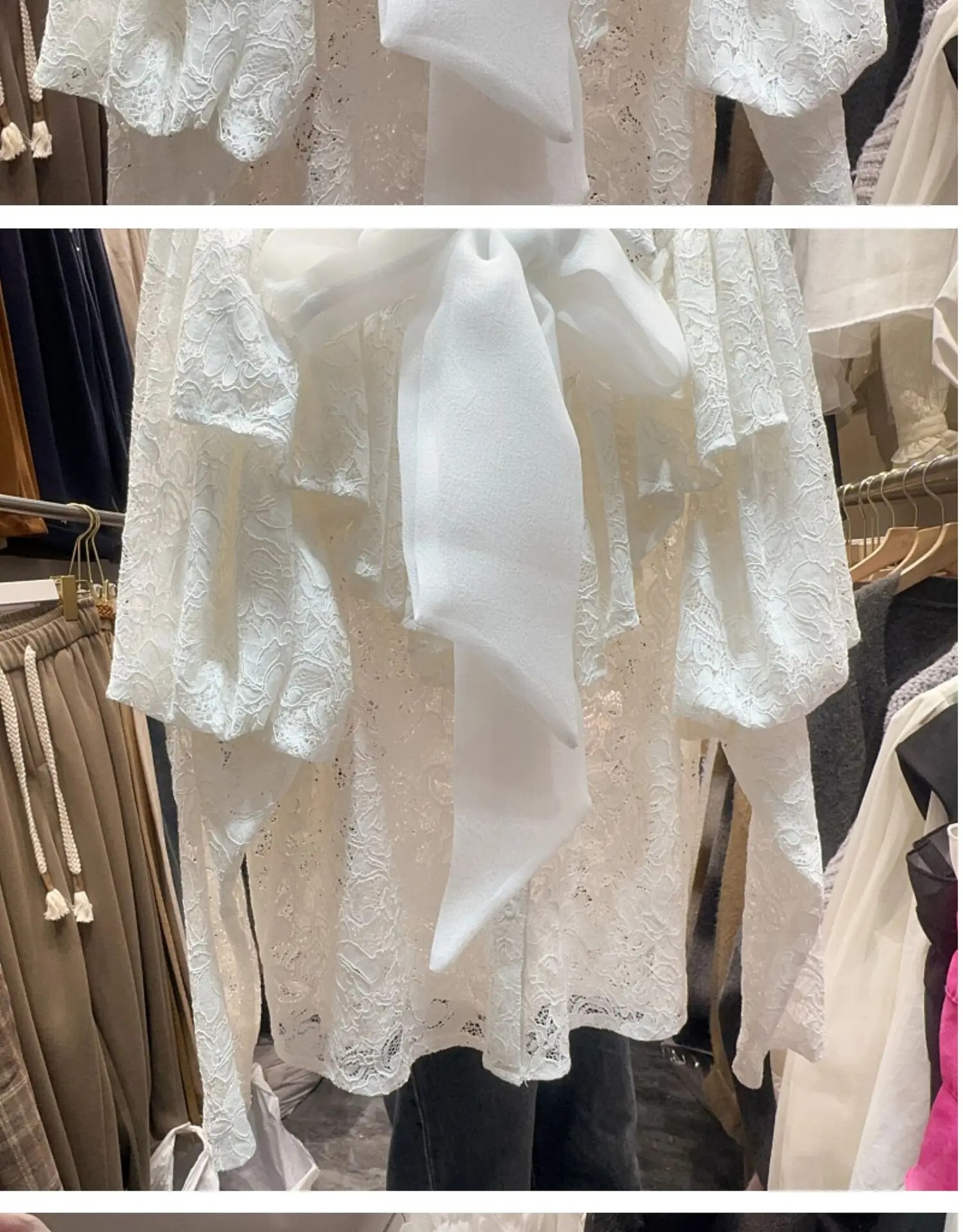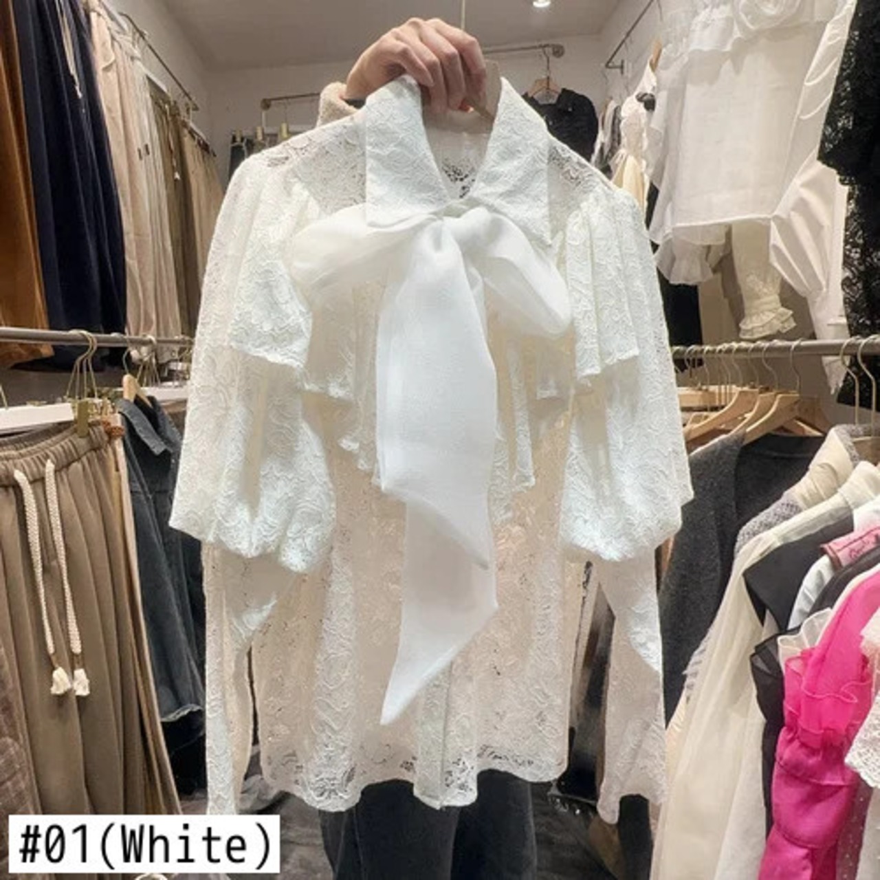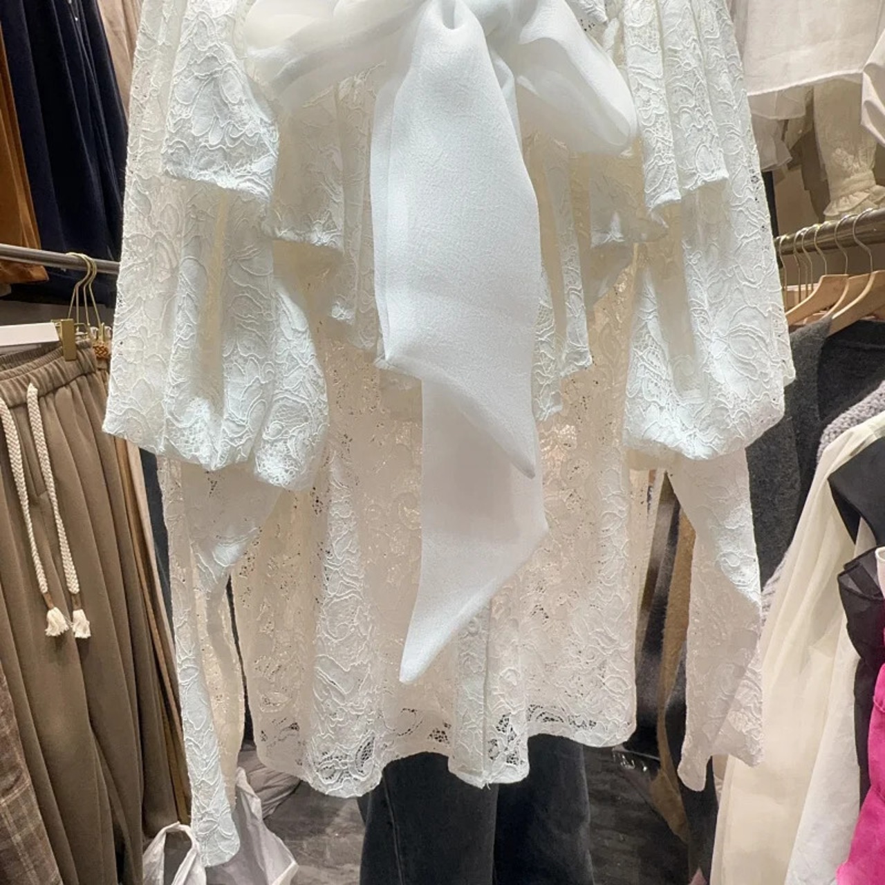 Nomikuma スイートロータスエッジスプライシングパフスリーブ蝶ネクタイ付きシングルブレストフックフラワーレースシャツ リボン 大人ガーリー スウィート キュート カジュアル フラワーデザイン