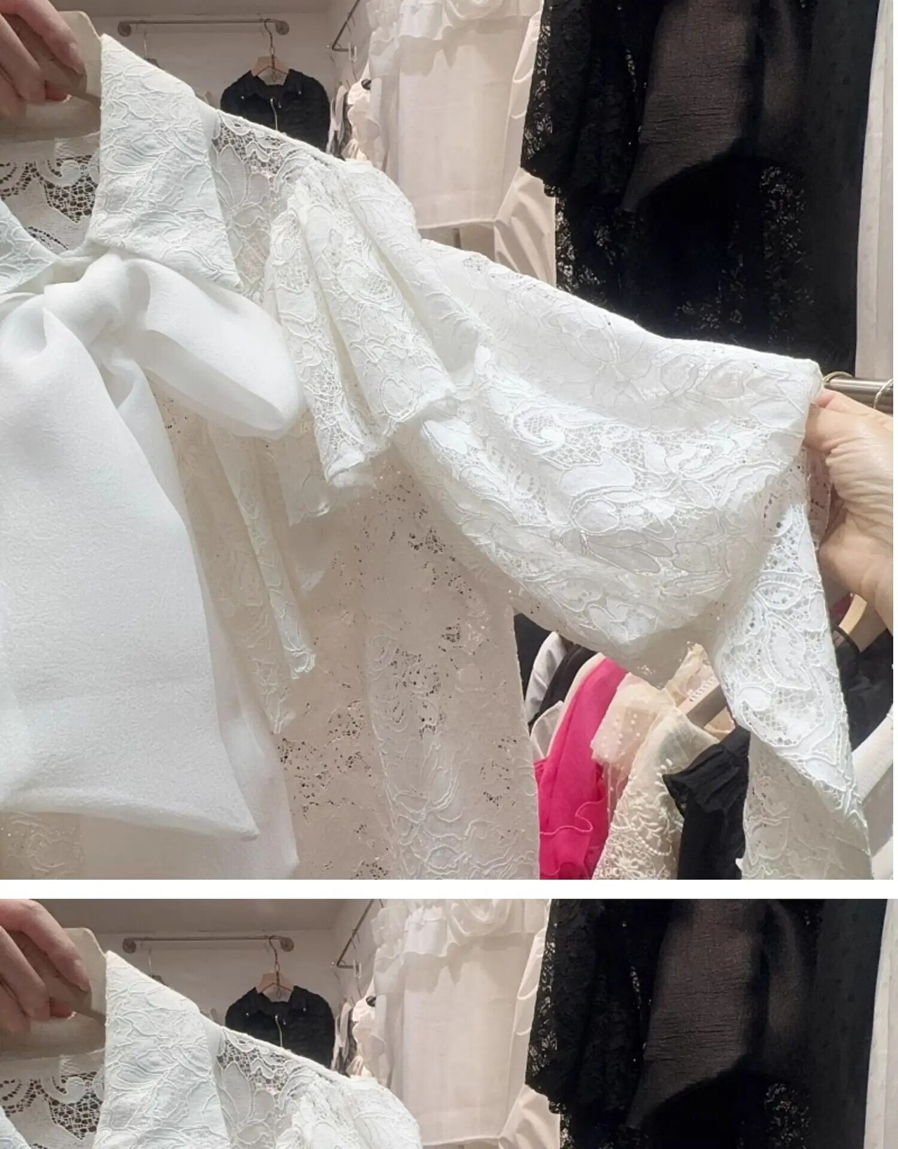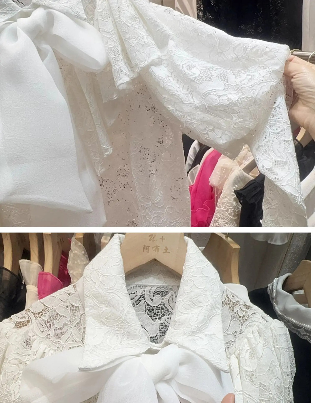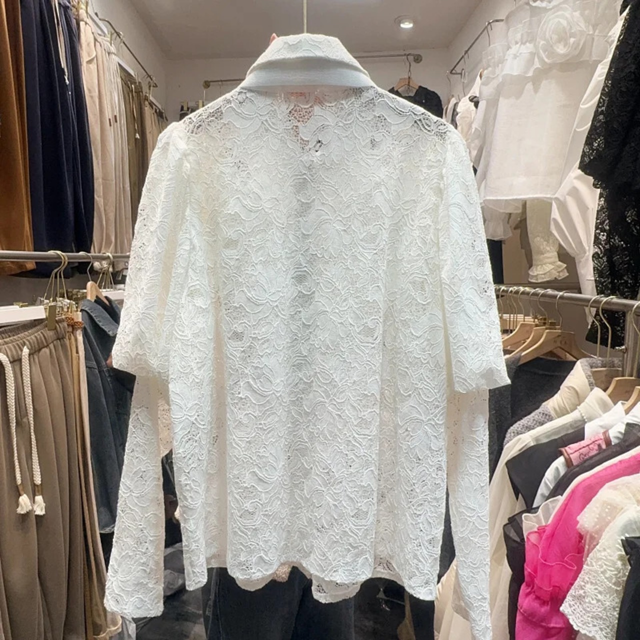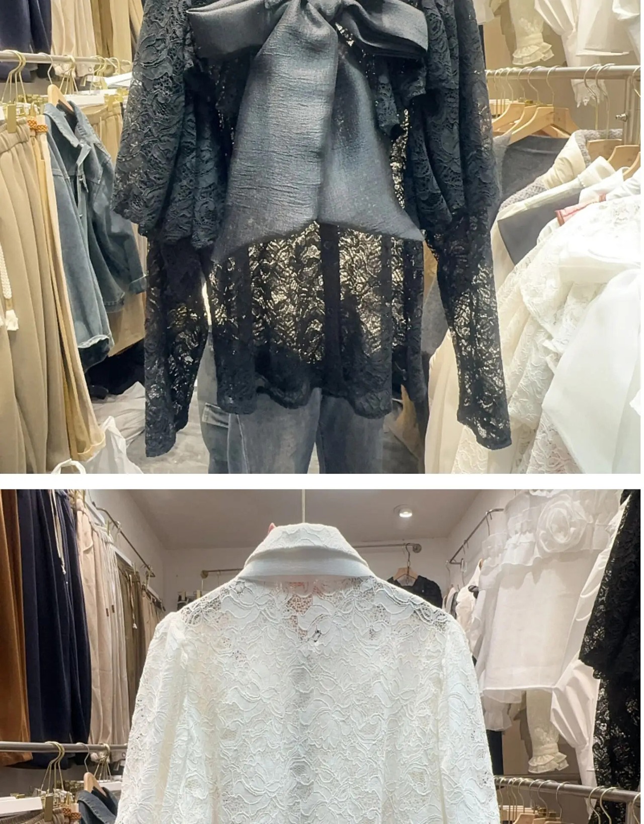 Nomikuma スイートロータスエッジスプライシングパフスリーブ蝶ネクタイ付きシングルブレストフックフラワーレースシャツ リボン 大人ガーリー スウィート キュート カジュアル フラワーデザイン