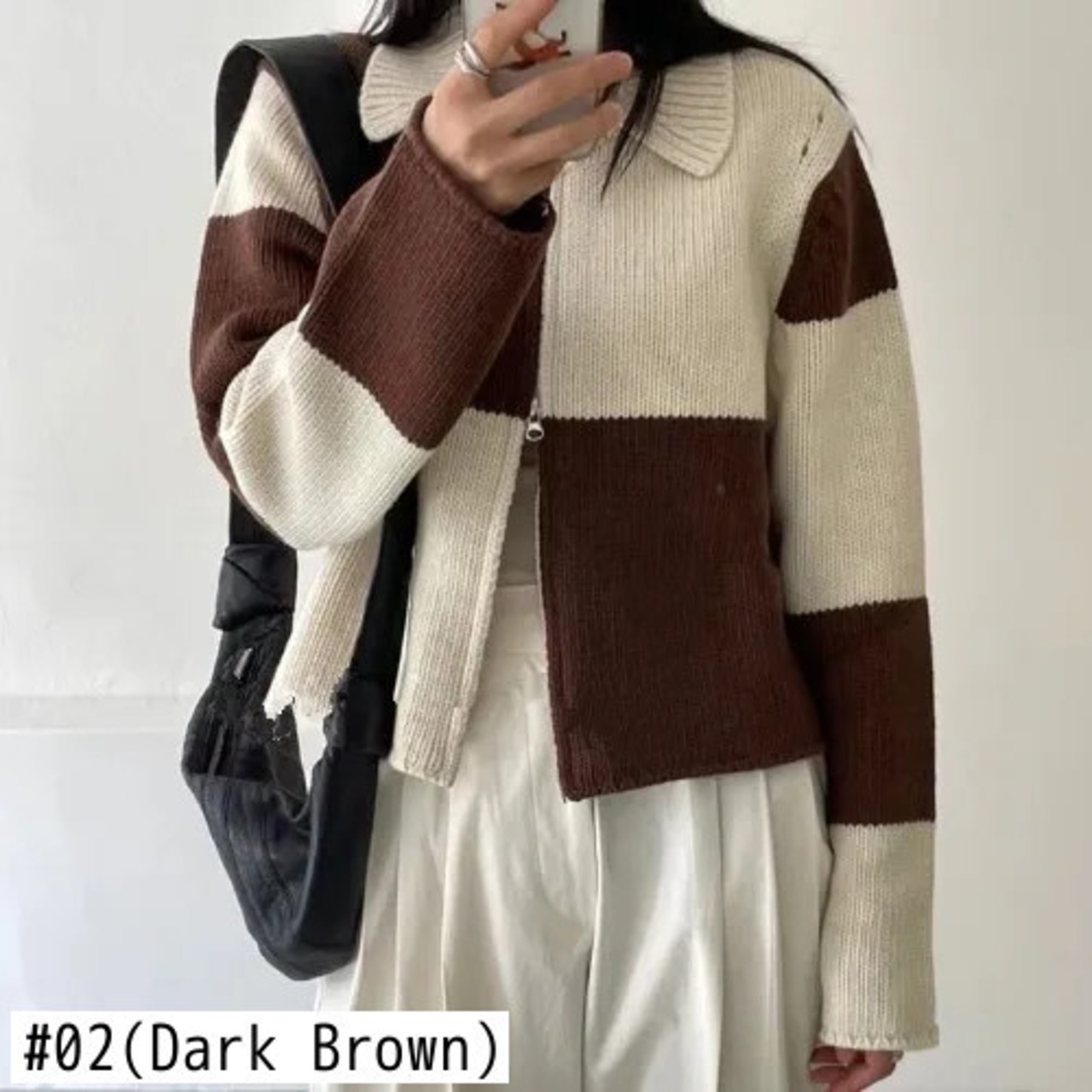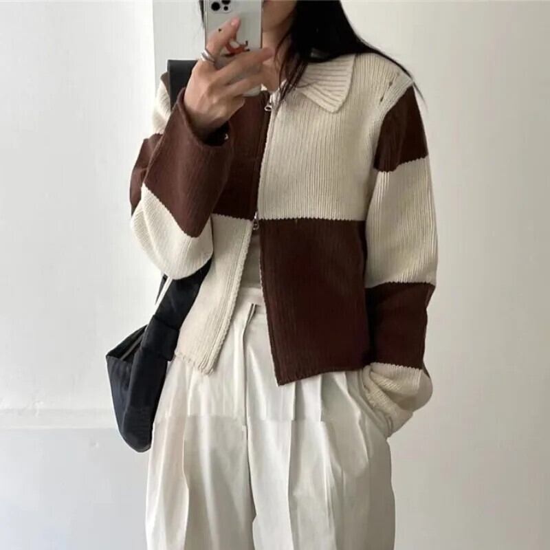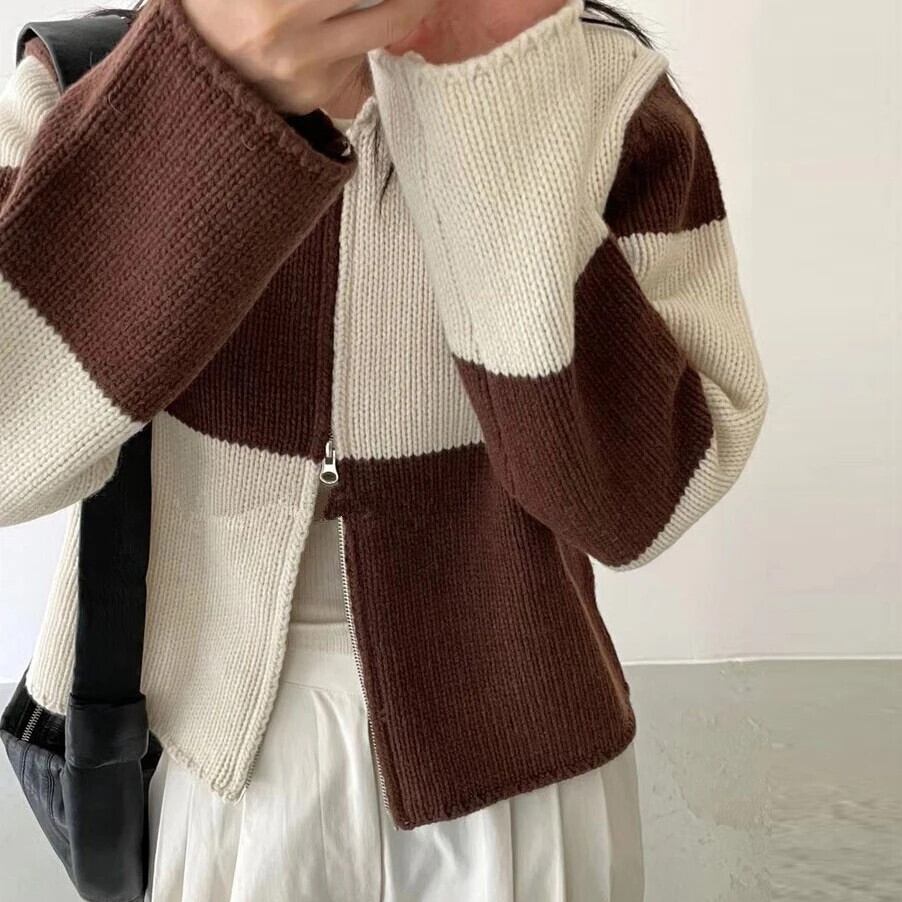 Nomikuma ターンダウン襟チェック柄ヒットカラー長袖ニットコート秋ダブルジッパーセーターコート ロング オータム 秋物