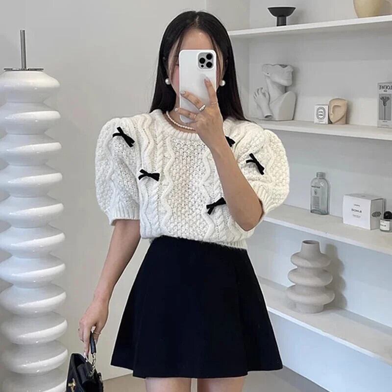 Nomikuma シック秋 O ネックボウ因果パフ半袖スイートシックプルオーバーニットセーター 2024 ニットトップ ショート リボン ハーフスリーブ 大人ガーリー スウィート キュート カジュアル オータム 秋物 Oネック