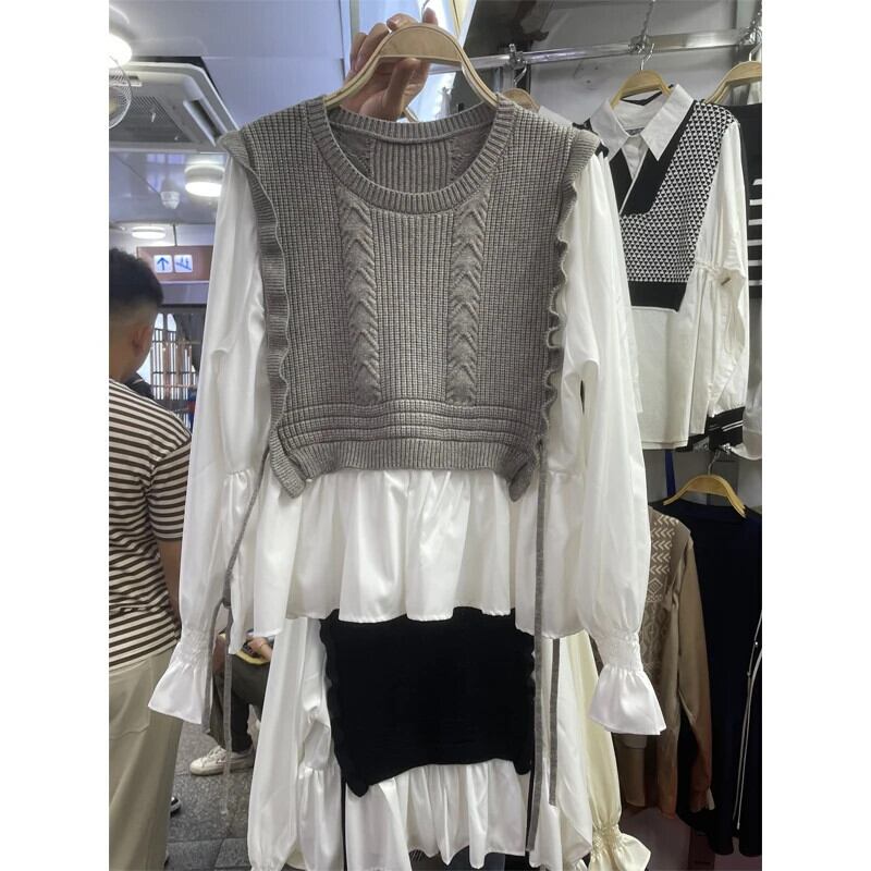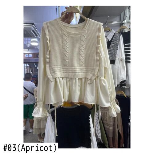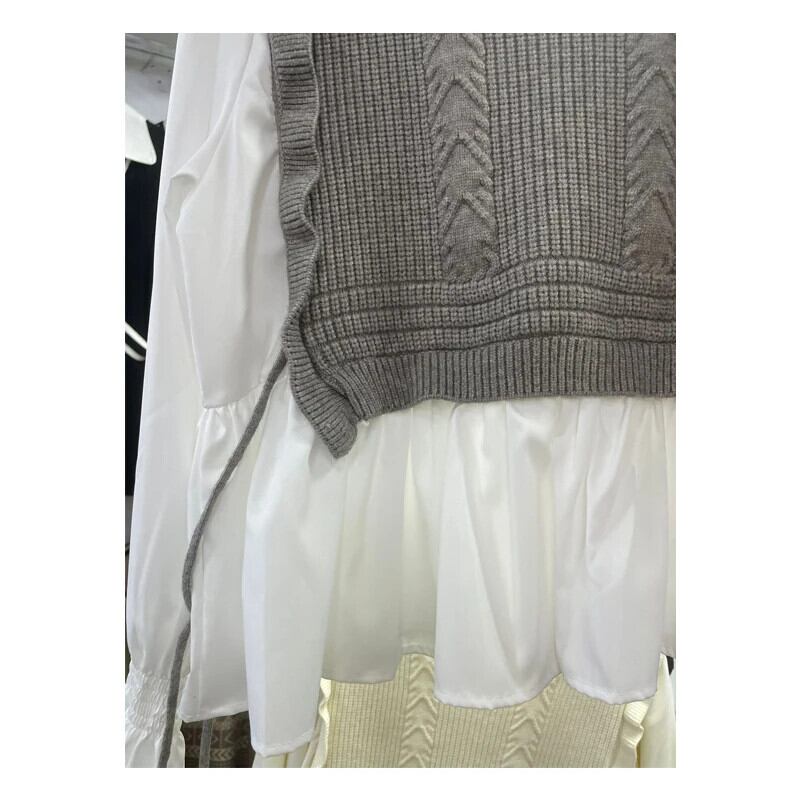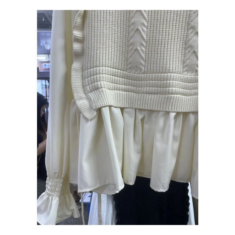 Nomikuma 2024 春 ニット パッチワーク シャツ レースアップ フレアスリーブ フェイク ツーピース ブラウス デ スプリング 春物