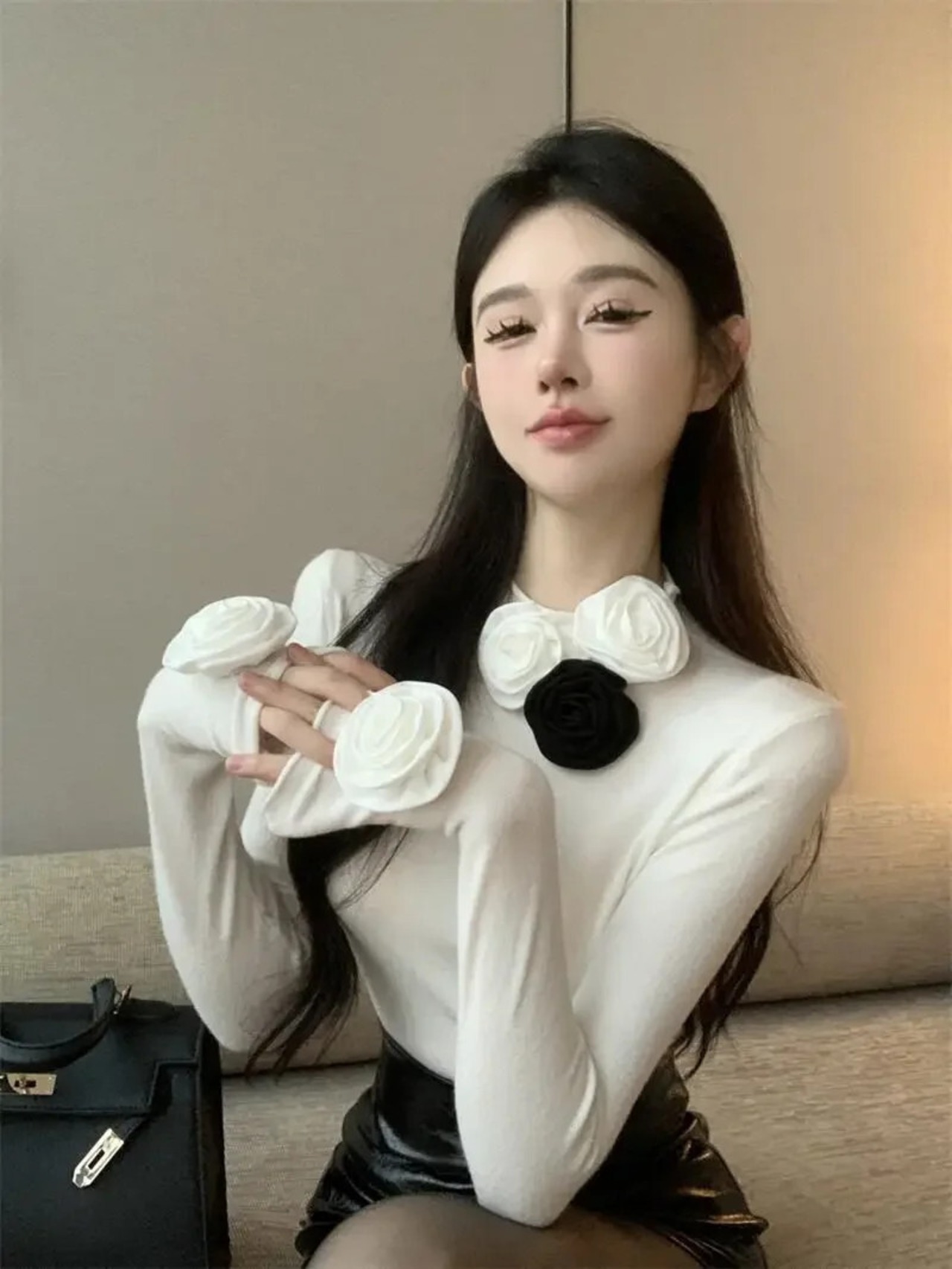 Nomikuma スパイシーガールスリムハーフカラー Tシャツ秋冬 Y2k トップ花長袖 Tシャツ ロング オータム 秋物 ウィンター 冬物 フラワーデザイン