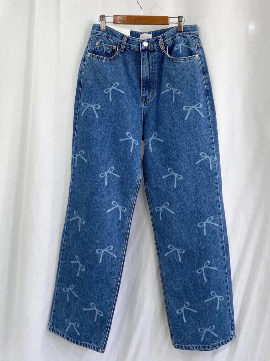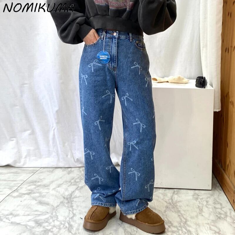 Nomikuma シック春ウエストリボンプリントウォッシュドデミンロングパンツ 2024 ストレートジーンズズボン スプリング 春物
