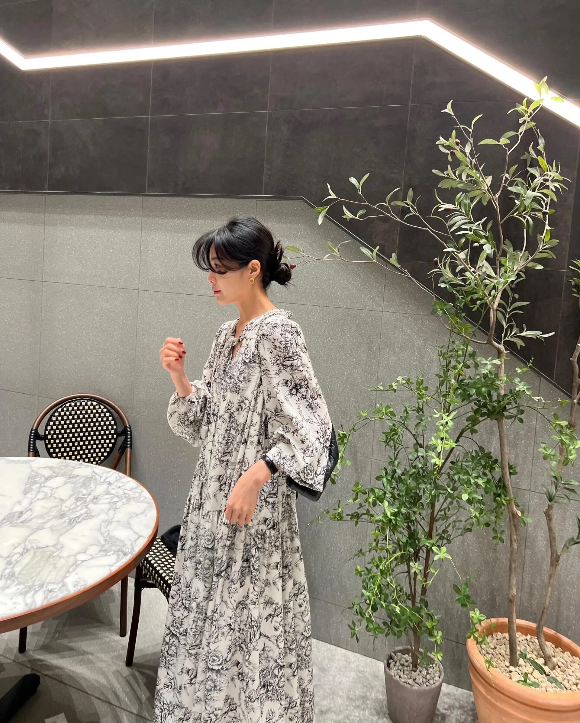Nomikuma シック春フレンチレトロインクフラワーレースアップウエストロングパフスリーブシフォンドレス 2024 ドレス スプリング 春物 フラワーデザイン