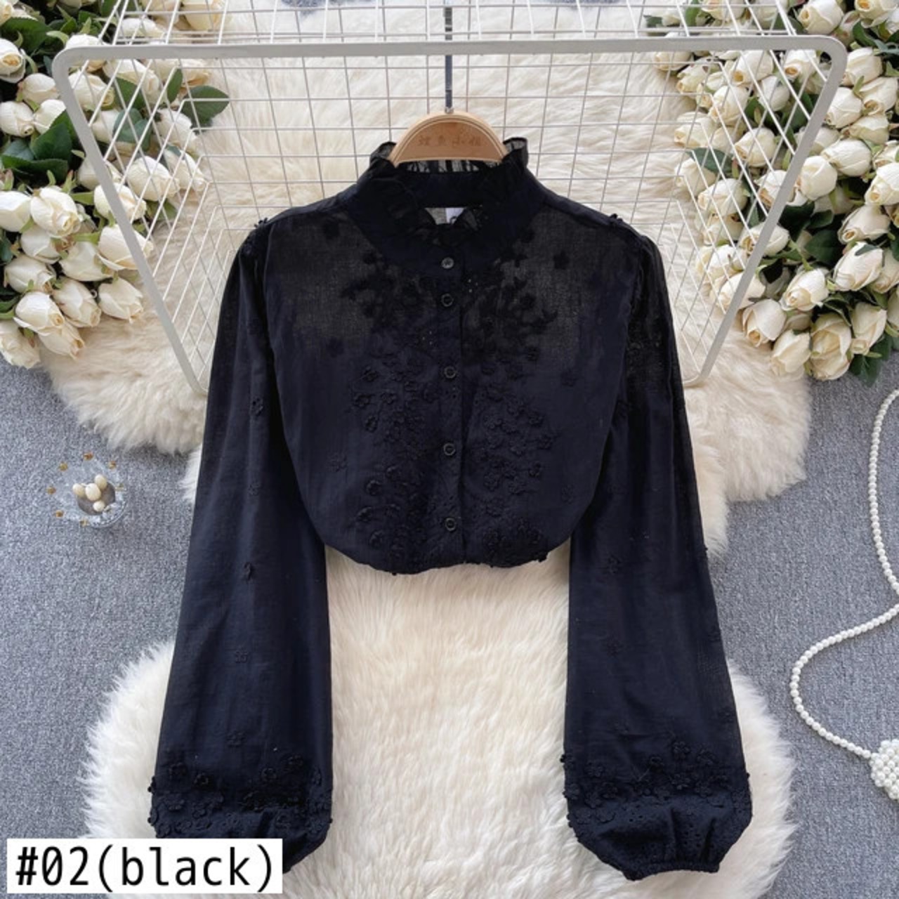 Nomikuma スイートシャツ 春 2024 レディース 刺繍入り木製耳襟パフスリーブトップ多用途ブラウス レッド 大人ガーリー スウィート キュート カジュアル スプリング 春物